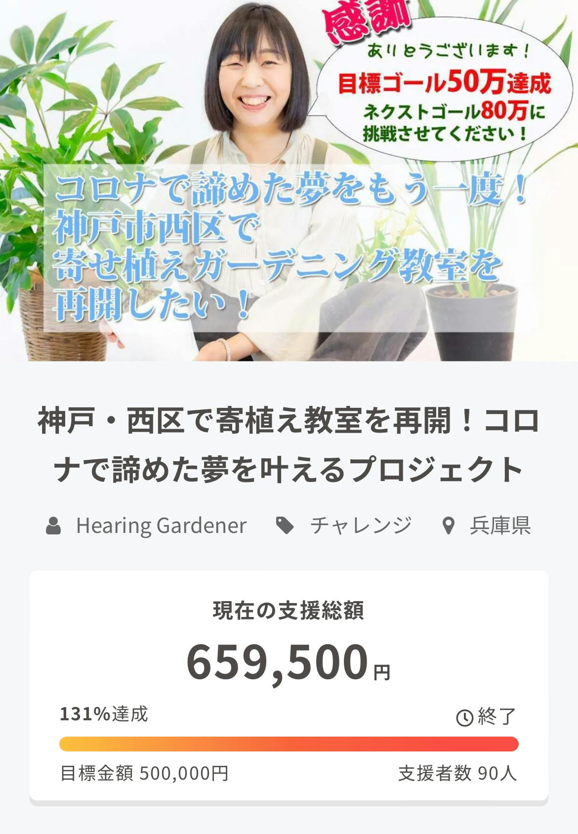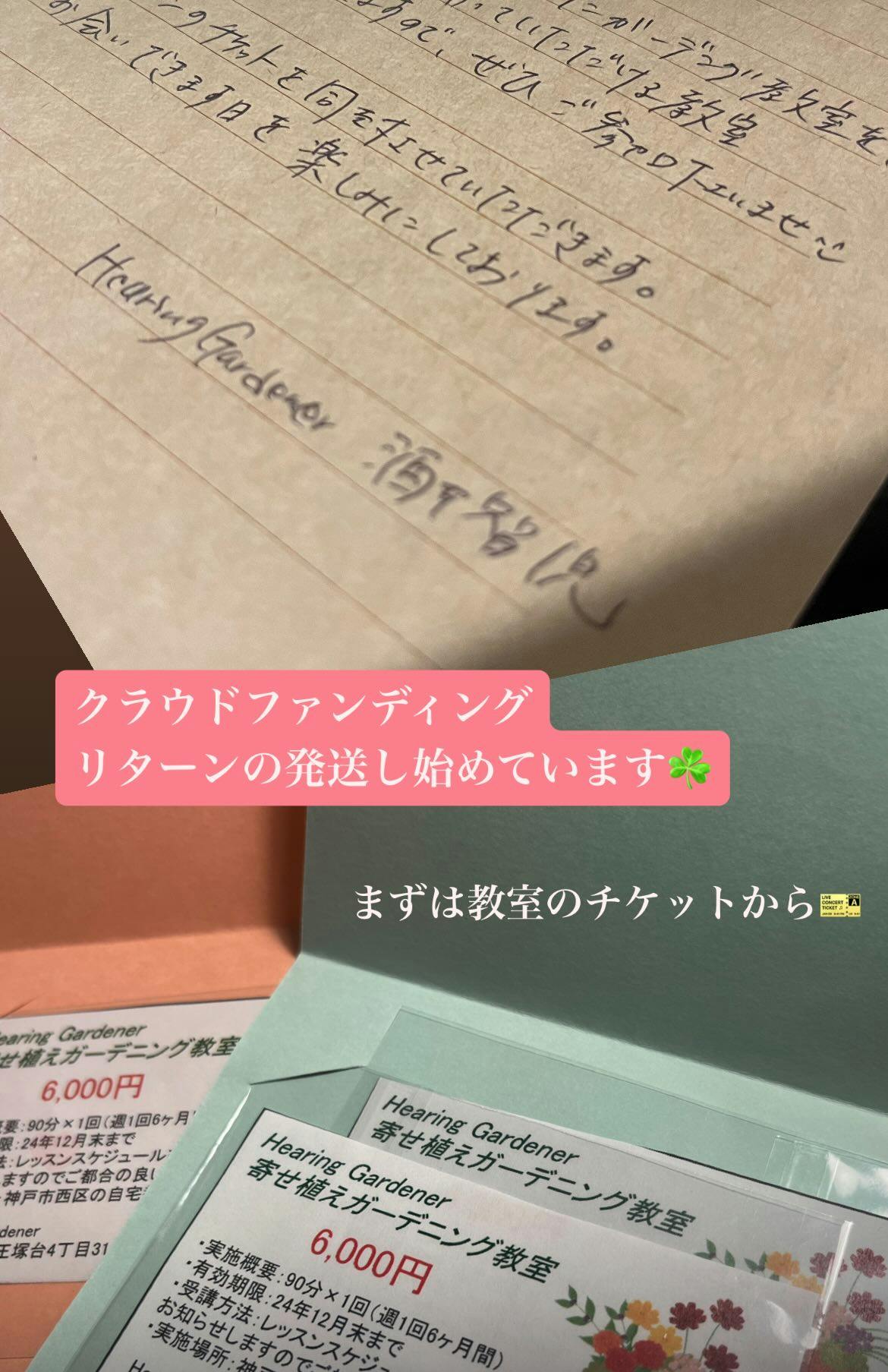 2024/08/01 19:23いつもありがとうございます。Hearing Gardener 酒井智児です。6月1日から挑戦してきましたガーデニング教室の再開をかけたクラウドファンディングが昨日無事に終えることができました。そして目標金額の130%を超えてご支援くださった方々90名を超えて終えることができました!これもひとえに応援くださった皆様のおかげさまです。本当にありがとうございました!!皆様からご支援いただきた大切なお金を教室再開の費用とリターン発送に。感謝を込めて使わせていただきます!!今後の教室作りの進捗など更新して参りますので、ぜひ今後も見守っていただければ幸いです。一先ず皆様にお礼をお伝えしたくメッセージさせていただきました。本当にありがとうございました^ ^そしてこれからもどうぞ応援よろしくお願い致します。Hearing Gardener 酒井智児2024.8.1 19:22 もっと見る