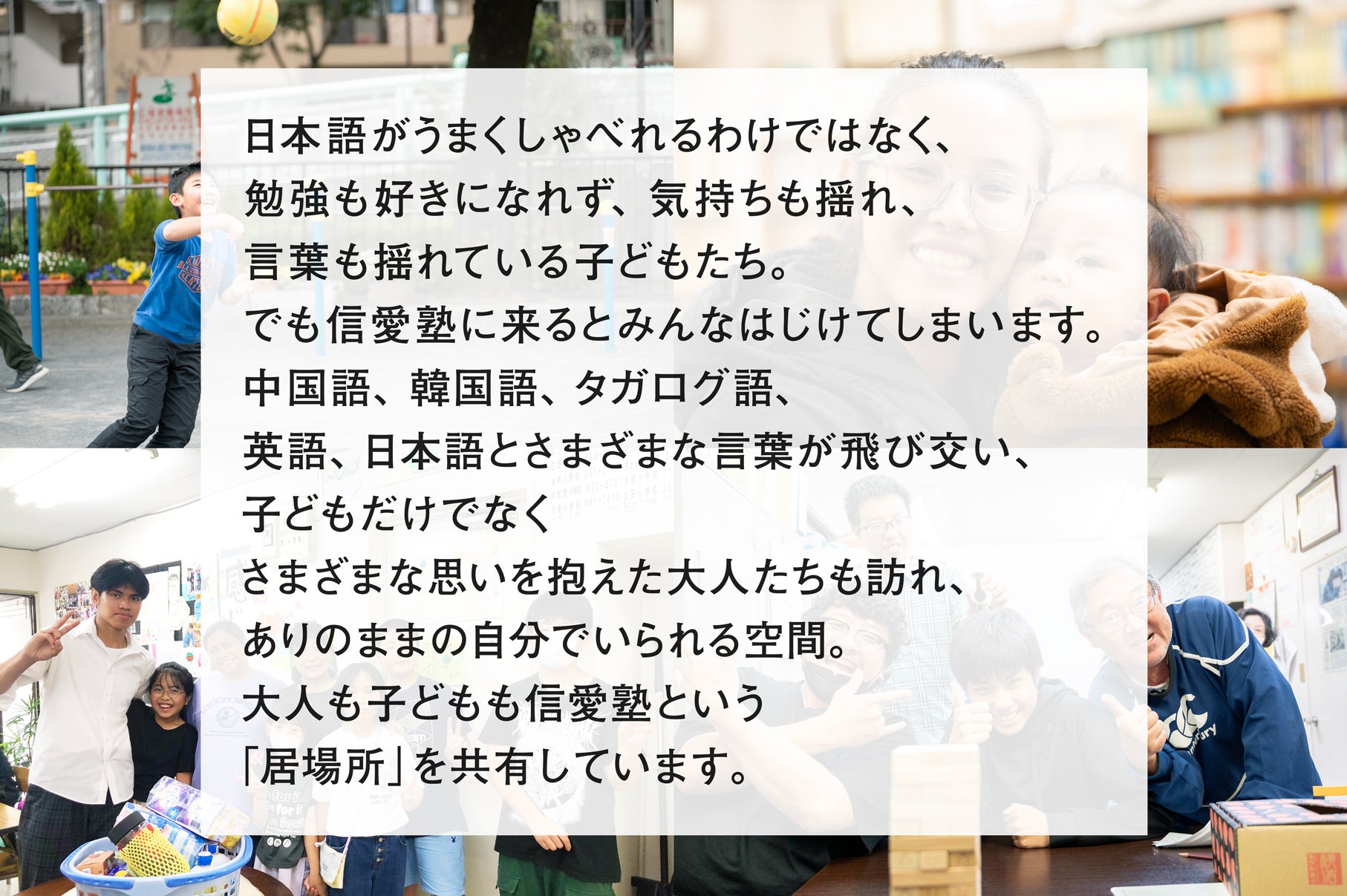 日本に暮らす外国籍及び外国につながる子どもたちを対象にした「居場所」利用による学習支援事業。学校や地域社会で緊張を強いられる子どもたちにとって、安全で安心に過ごせる信愛塾は、家でも学校でもない第三の「居場所」です。そこでは母語による学習支援や日本語指導を無償で受けることができ、学習が終わった後はスポーツ・音楽などを楽しむことができます。言葉の壁にぶつかり、学校や日常生活でストレスを抱える子どもにとって心を解き放つ場となります。また貧困などで安定して食事を取れない子どもたちを対象に、食育研究家の協力を得て食事を提供し、フードバンクや関係団体の協力を得て食料品や日用品の提供も行っています。