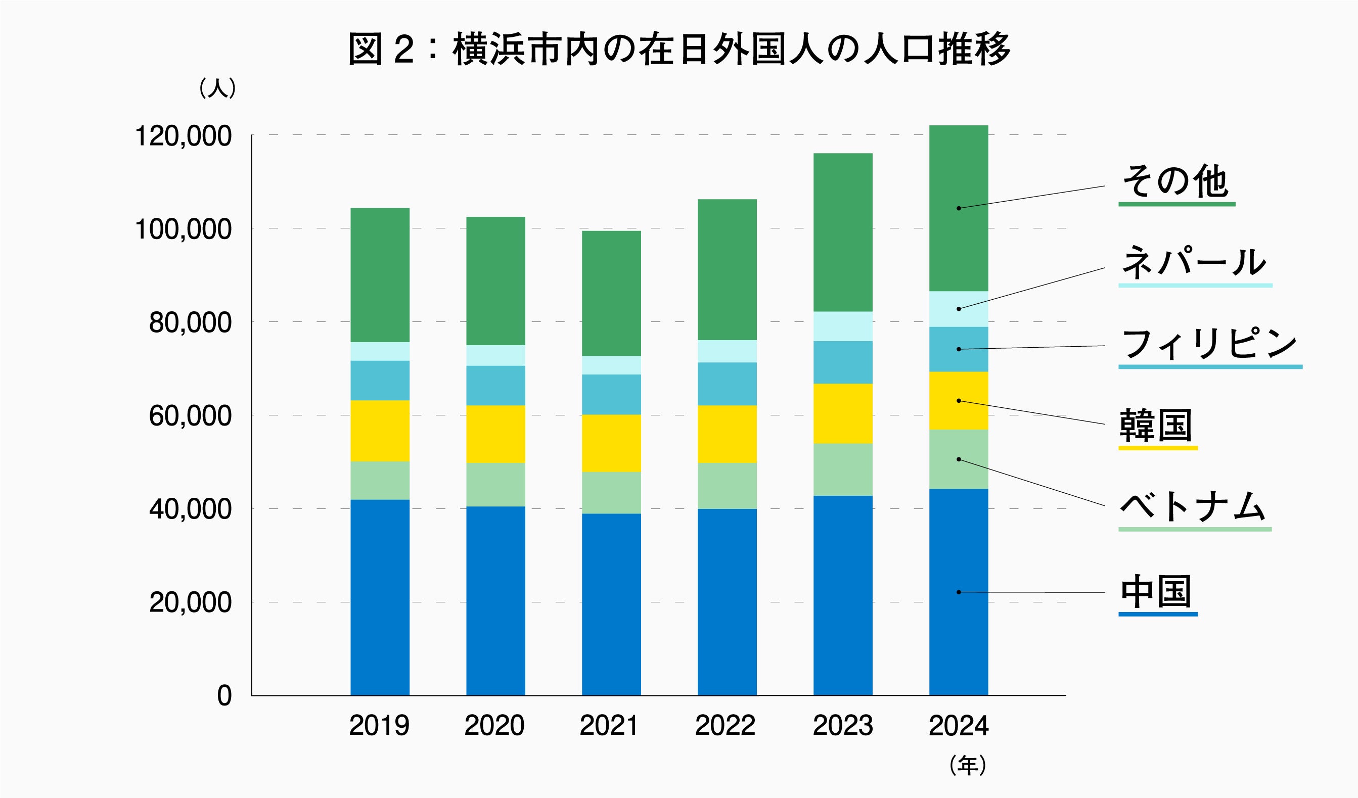 現在、横浜市の外国人住民は約12万2千人で、およそ市民の31人に1人が外国人となります。横浜市が公開する市内在住外国人の統計を確認すると、2020年〜21年にかけて新型コロナウィルスの影響などを受け減少していた外国人の人口が、 2021年以降、再度上昇傾向にあり、2021年〜24年7月にかけて約22.9パーセント増加しています(図2)。こうした市内在住の外国人の7割以上は、中国、韓国、ベトナム、フィリピン、ネパールといったアジアの国々の出身者であることがわかります。