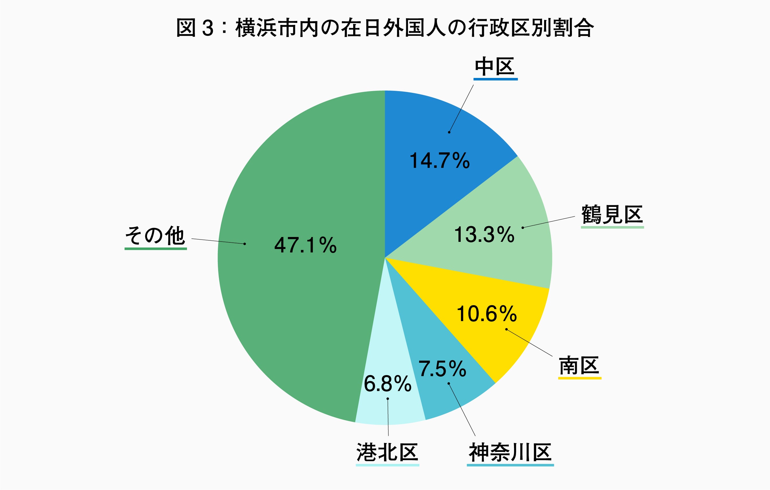 2024年7月末現在、横浜市の人口全体に占める外国人の割合は約3.2パーセントで、国の人口全体に占める外国人の割合が約2.8パーセントであることを考えると、横浜市に暮らす外国人の割合は国全体の割合よりも若干高いことがわかります。また、外国人住民の半数以上が18区ある行政区の中でも、中区、鶴見区、南区、神奈川区、港北区の5区に暮らしており、横浜市内でも一部の地域に外国人住民が集中して暮らしていることがわかります(図3)。