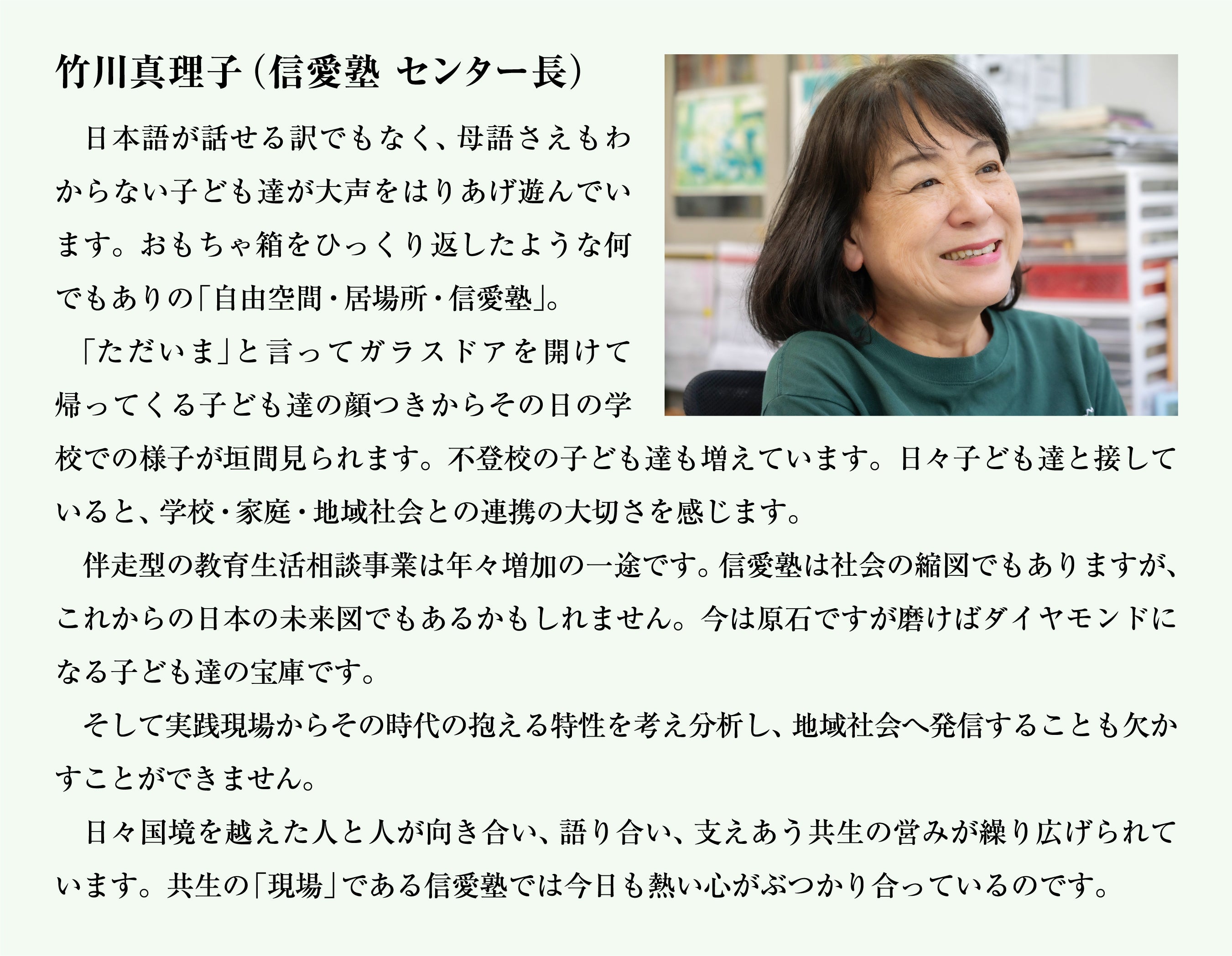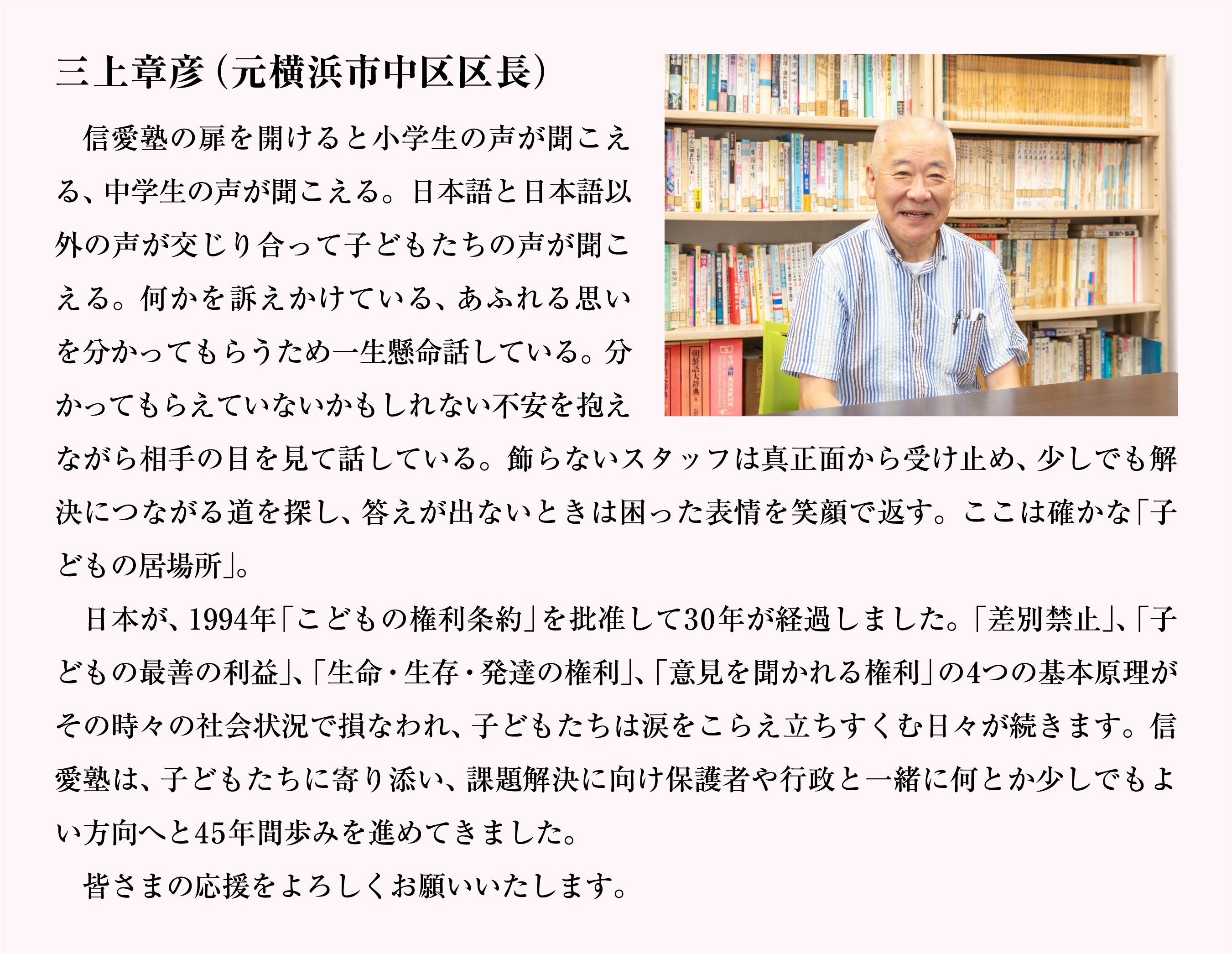 団体発足から45年間、一貫して「子どもの命を守る」ことを使命とし、「差別を許さない、差別をなくす」ための行動を続けてきました。信愛塾では子どもの利益を最優先に考え、一人ひとりの「背景に寄り添う」姿勢で保護者も含めて支援を行っています。そして国籍を理由とした差別などに声を上げてきました。現在も様々な関係機関や団体と連携し、地域からの持続性のある共生社会の実現を目標に活動しています。