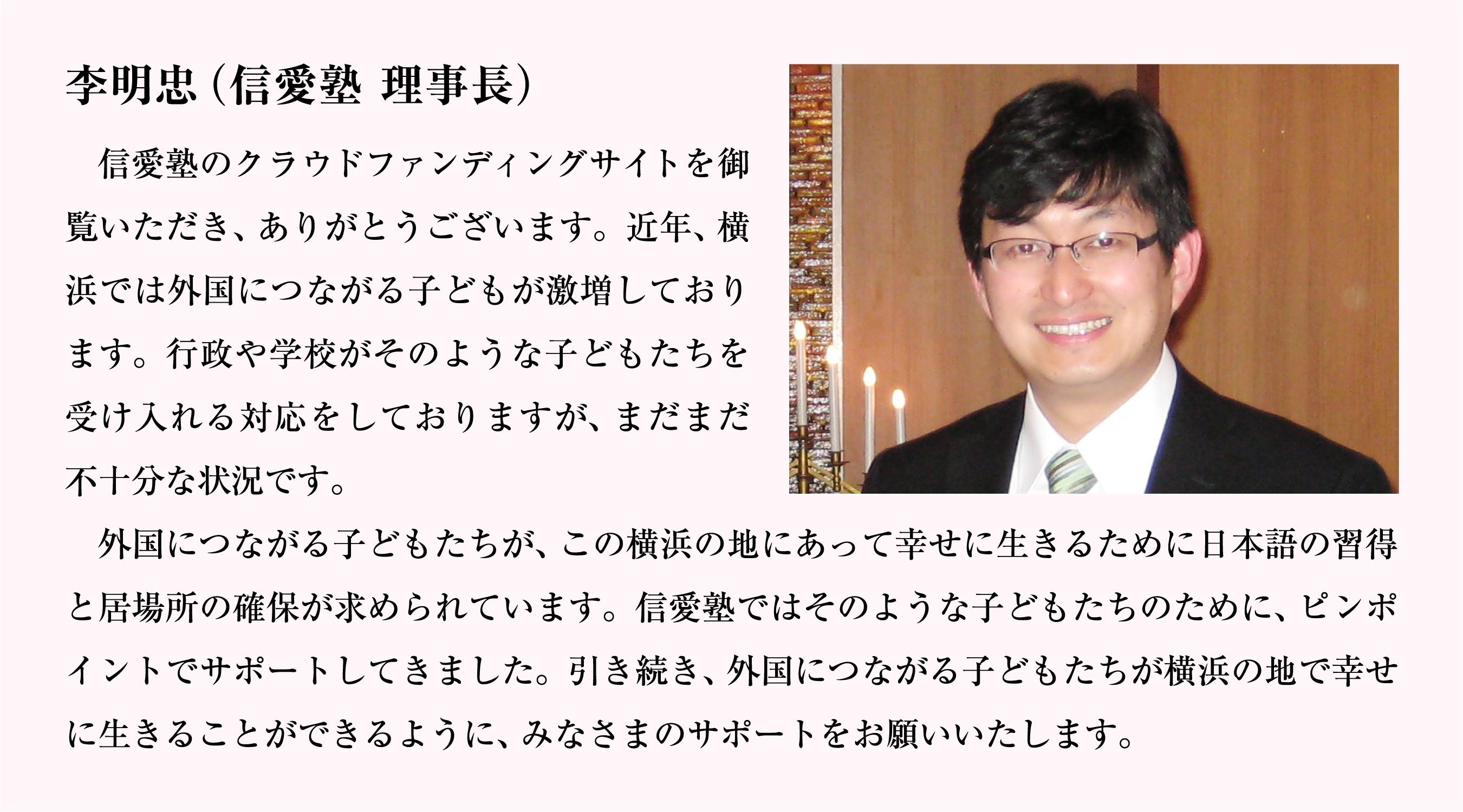 収益を伴う事業がない信愛塾が45年間も活動を続けてこれたのは、多くの方々の熱いご支援があってのことです。私たちの活動にご理解をいただき、「共に生きる」社会を築くためには、そして未来を担う子どもたちのためにはどうしても信愛塾という「場」が必要になり、この「場」を維持を続けていきたいと考えています。