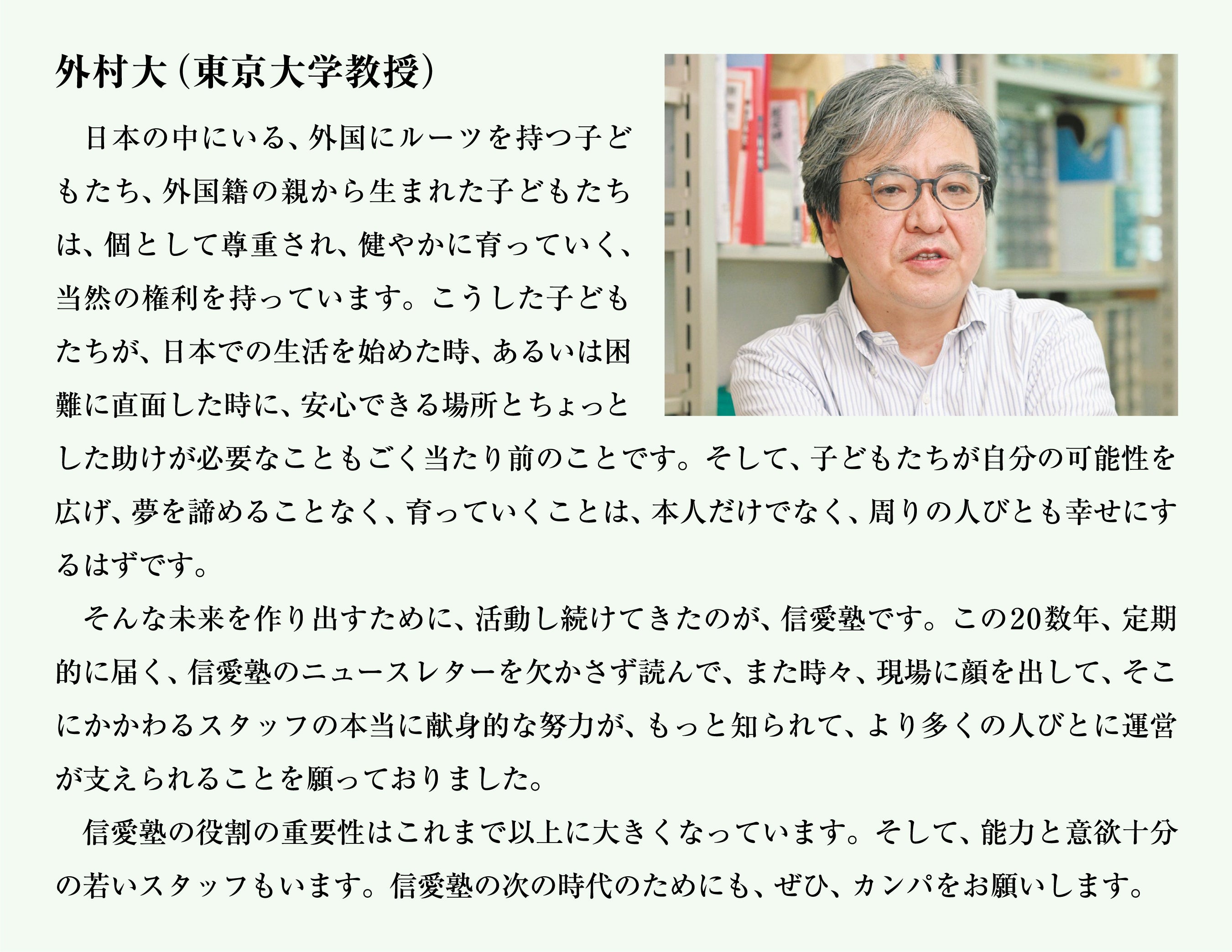 団体発足から45年間、一貫して「子どもの命を守る」ことを使命とし、「差別を許さない、差別をなくす」ための行動を続けてきました。信愛塾では子どもの利益を最優先に考え、一人ひとりの「背景に寄り添う」姿勢で保護者も含めて支援を行っています。そして国籍を理由とした差別などに声を上げてきました。現在も様々な関係機関や団体と連携し、地域からの持続性のある共生社会の実現を目標に活動しています。