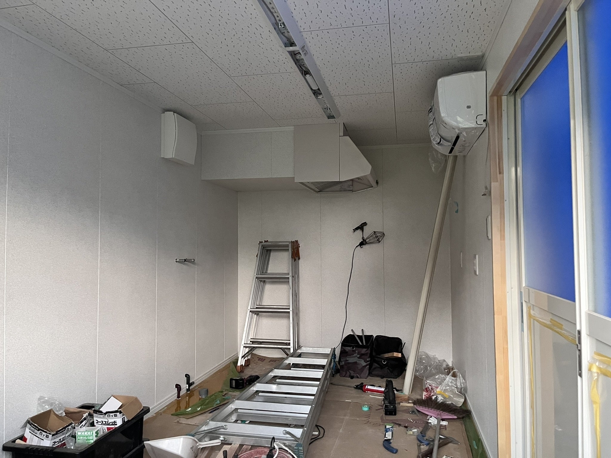 まだ、厨房機器は入っていませんが、作業台のすぐ上にエアコンが付くので、頭を風が吹き抜けることになるかも。。。とか、換気扇の位置が低いので、頭をぶつけないようにしなければ。。。とか、慣れるまではちょっと大変そうだなと思っています。