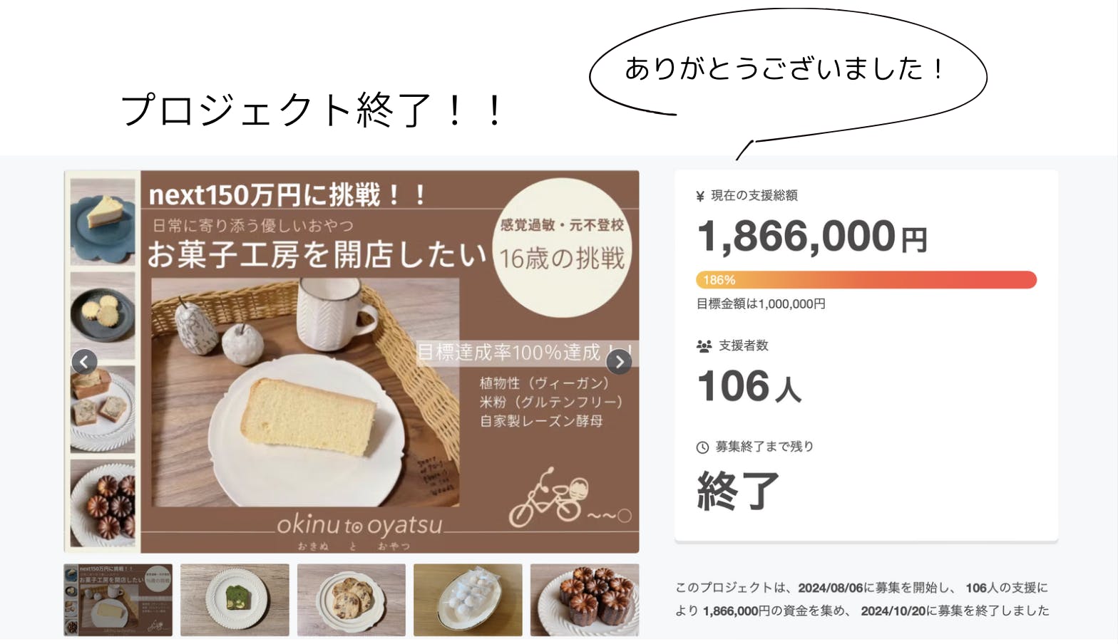 8月6日から開始したプロジェクトが、昨日10月20日に大成功で終了しました!