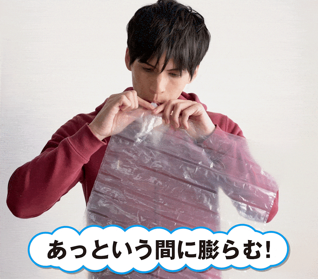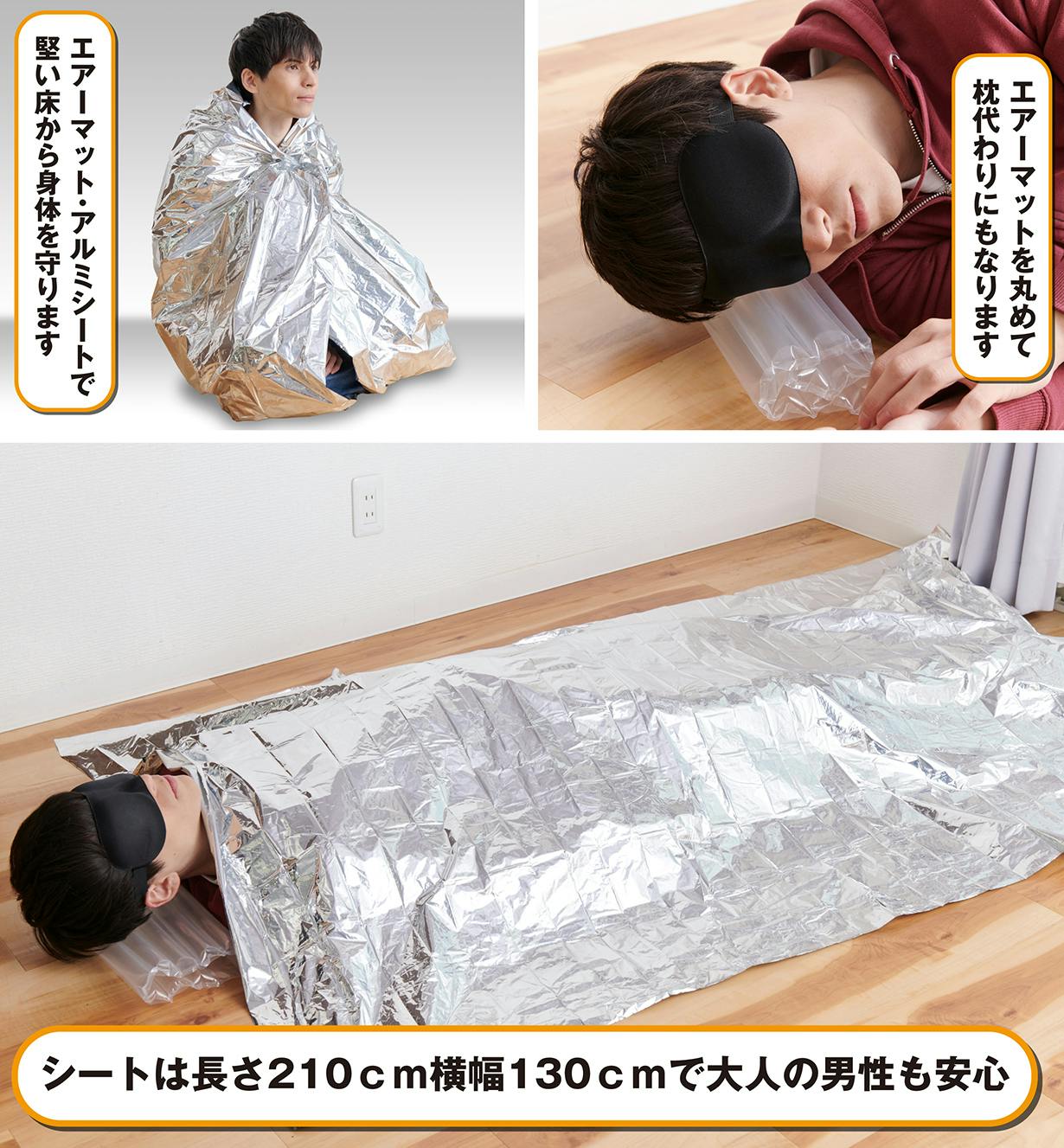 エア座布団をくるくるっと巻けば枕としても使用できます。大変な状況の中でも、防災キットIRETOKOがあれば、エア座布団・静音アルミシート・アイマスク・耳栓を使って身体を休める環境を確保することが出来ます。