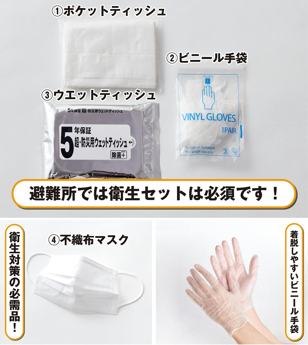 避難所などは、場所によっては衛生面で清潔とはいえない所もあります。避難所に大勢の人が密集する恐れもあります。流行している病気の対策の為にも、衛生用品は必須アイテムです。
