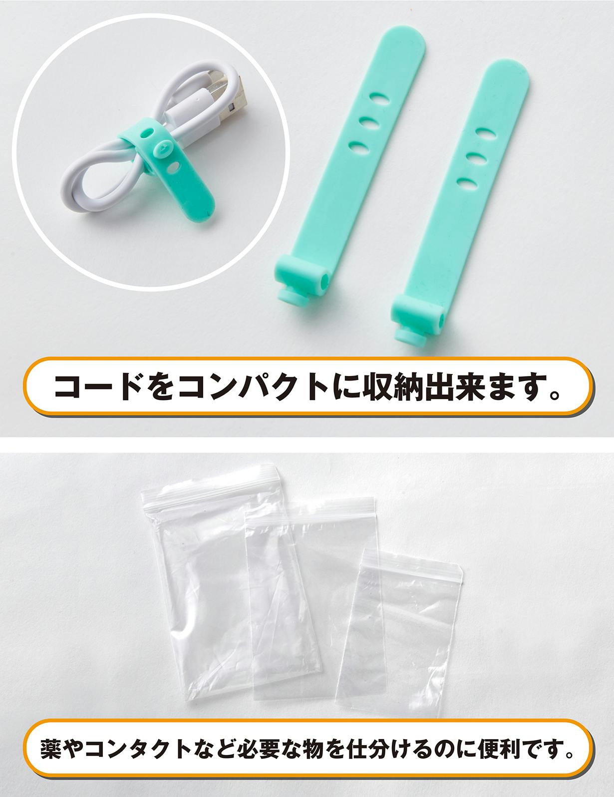 ・保険証のコピー・現金(小銭)・充電ケーブル・常備薬・コンタクトレンズ等々。1人1人が自分に必要な物をジッパー付きの袋、大・中・小の3種類に仕分ける事が出来ます。ケーブルもバンドを使えばゴチャゴチャにならずに便利です。