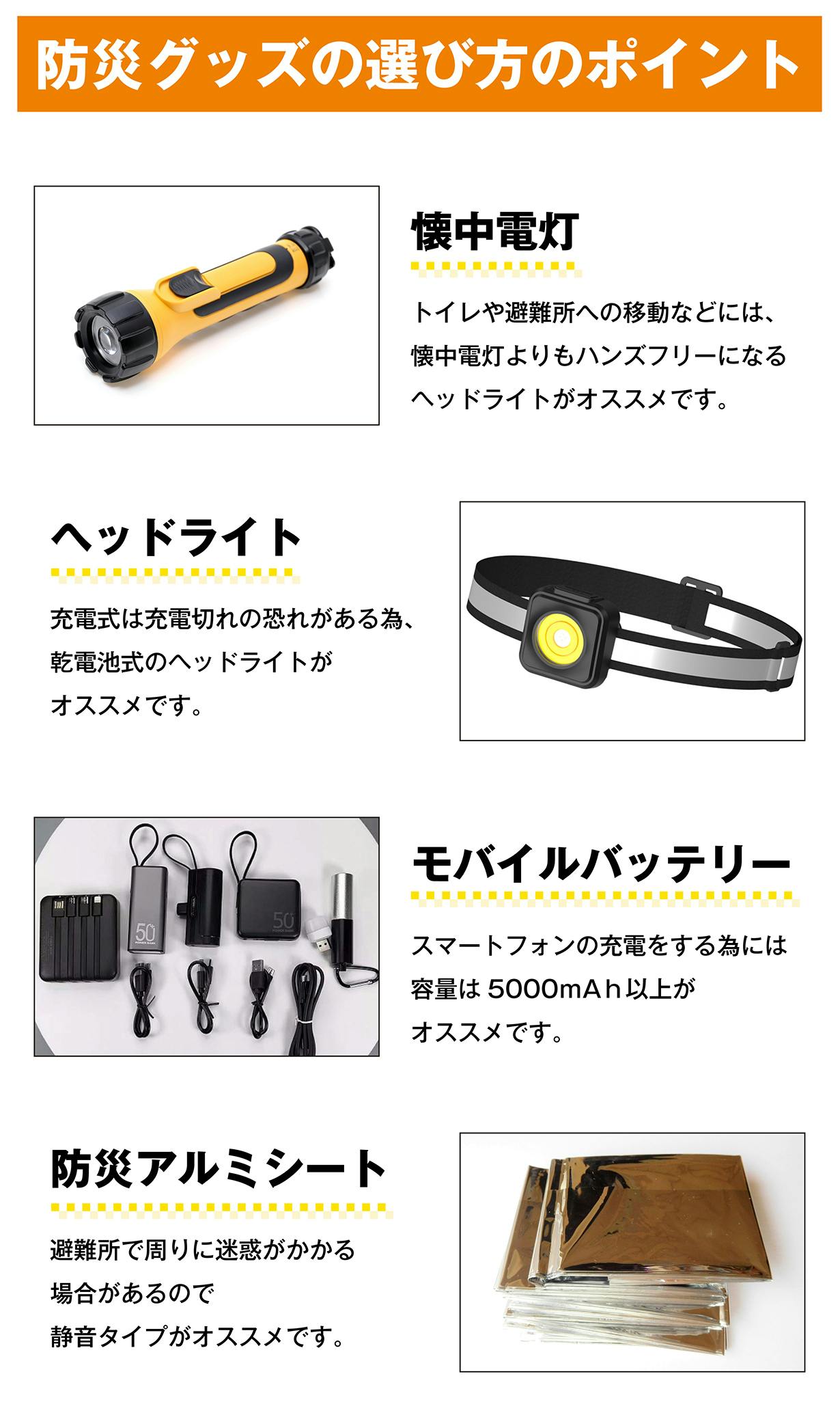 停電になった場合、充電出来るモバイルバッテリーが大変重宝します。避難中のスマートフォンの充電切れは、ニュースも見れない、大切な人と連絡を取る術も無くなる。災害によって気持ちが不安定な状況で外部への連絡が途絶える事は、より一層の孤独感に襲われ不安な気持ちを増させます。防災キットIRETOKOのモバイルバッテリーは5000mAhを採用しました。容量が大きい物は重さも相当増えるので「重いから持ち歩くのを辞める」なんて事になってしまったら本末転倒。私たちの願い「持ち歩いて欲しい」を優先し十分な容量で軽量な5000mAhを採用しました。