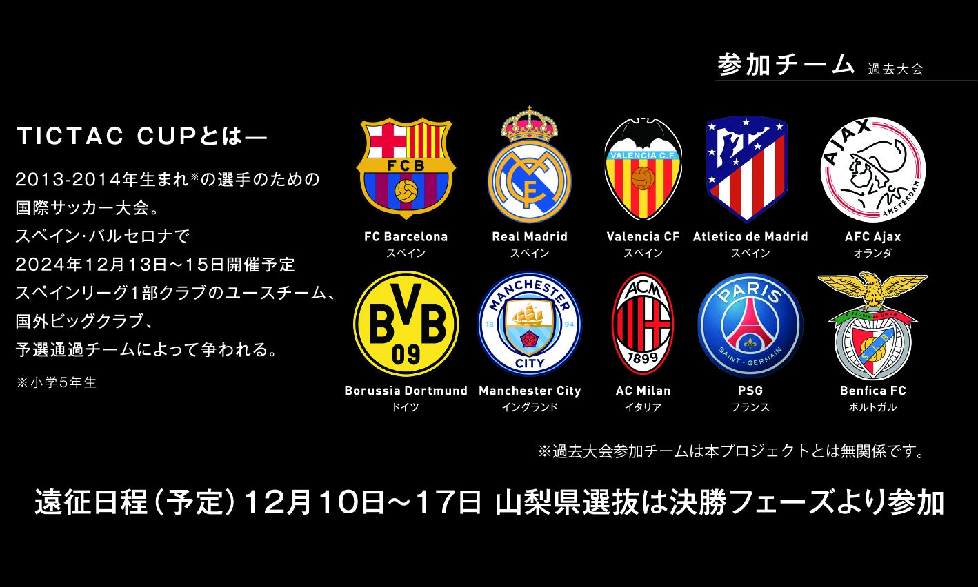 本プロジェクトは「〜山梨の小学生へ世界挑戦で成長の機会を〜」をコンセプトにスペイン・バルセロナで12月に開催される小学生年代のチャンピオンズリーグ「TIC TAC CUP」に山梨選抜(小学生10名)を「無償派遣」し、帰国後に現地で体験した「技術」や「文化」を地元所属チームに還元する内容となっております。