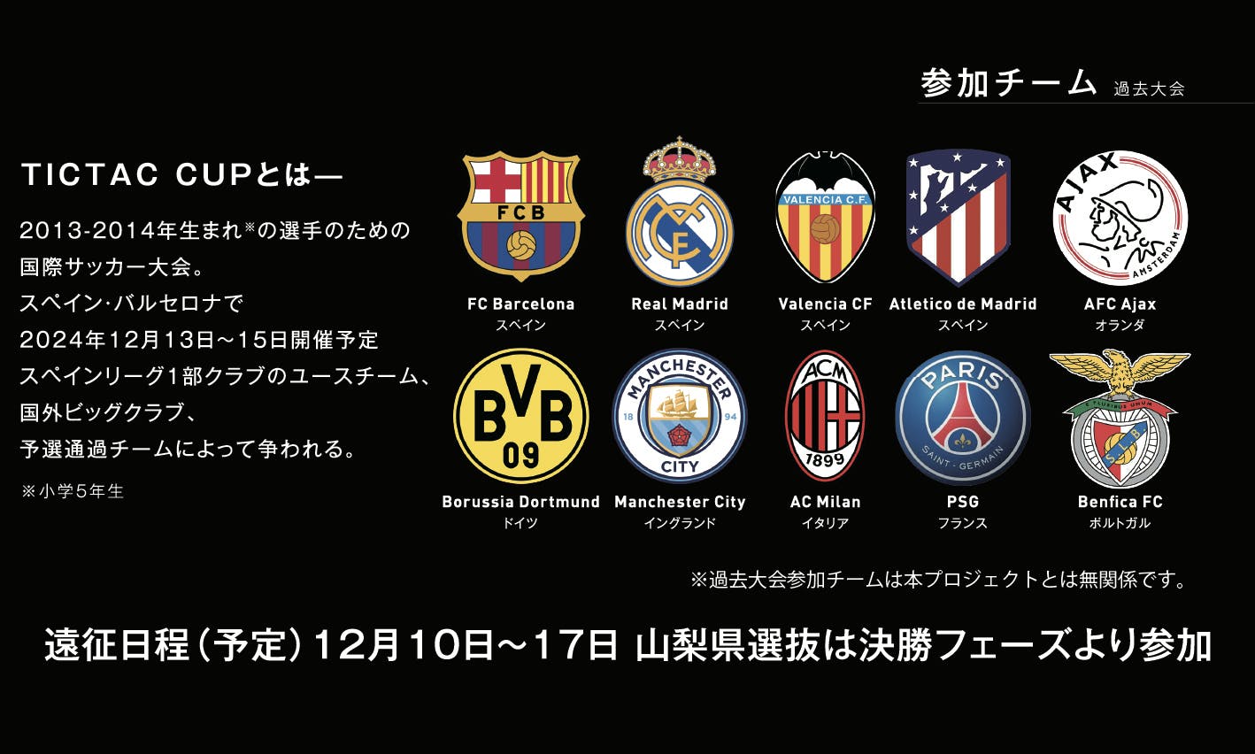本プロジェクトは「〜山梨の小学生へ世界挑戦で成長の機会を〜」をコンセプトにスペイン・バルセロナで12月に開催される小学生年代のチャンピオンズリーグ「TIC TAC CUP」に山梨選抜(小学生10名)を「無償派遣」し、帰国後に現地で体験した「技術」や「文化」を地元所属チームに還元する内容となっております。