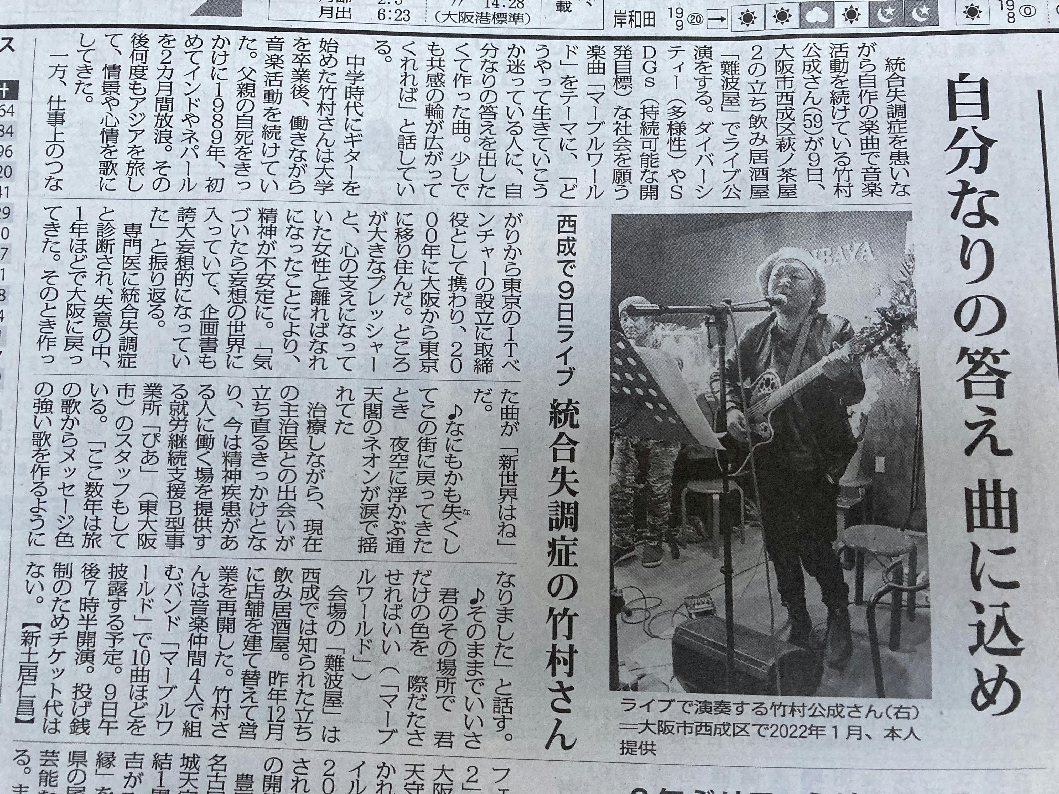 竹村公成(1963年生)15歳の頃から独学で作詞作曲を試み1990年代は、広告代理店に勤務する傍らインドを中心としたアジア諸国を旅した情景を楽曲で表現、アジアンエキスプレスとしてライブ活動を展開する。2000年、ITベンチャー企業の取締役として東京に移転。女優の秋吉久美子とライブをするなど活動の幅を広げるが、激務に追われ統合失調症を発症し帰阪。精神病院への入退院を繰り返す中、2005年ファーストアルバム『LOVE』を発表。現在は、障害者支援施設の支援員として働きながら音楽を発表することをライフワークとして生きている。2022年、自身の生き様が、関西テレビ放送報道ランナーの特集として報道される。2023年、自身のバンド、マーブルワールドによるアルバム「マーブルワールド」を発表。2024年、訪問看護師との運命の出会いにより、彼女への楽曲「Yuriシリーズ」を17曲YouTubeに発表。現在、「Yuriシリーズ」のアルバム「Yuri 100%]をすべくクラウドファンディングを実施中。