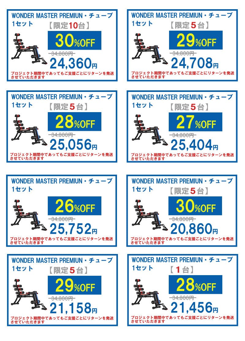 2024/07/31 15:52このたびはご支援とお気に入りとご興味をいただきましてありがとうございます。プロジェクト期間が残り1日を切りました。トレーニングマシンセットにご関心をお持ちの方は、プロジェクトが過ぎてしまうとこのご支援額でご支援いただけなくなりますので、この機会をお見逃しなくこのプロジェクトが終了する前にご支援を賜りましたら幸いです。よろしくお願い申し上げます。 株式会社フェリクス もっと見るプロジェクトの終了日まで残り1日となりました