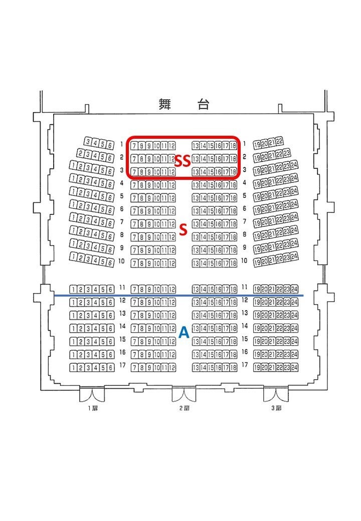 ご支援の際には各コースの中からお選びください。観劇チケットは、先行予約特典として三越劇場の真ん中の前方のSS席(赤枠内)を確保しております。ご予約順にお席を決めさせていただきます。S席に関しても同様に良い席から順に埋めていきます。