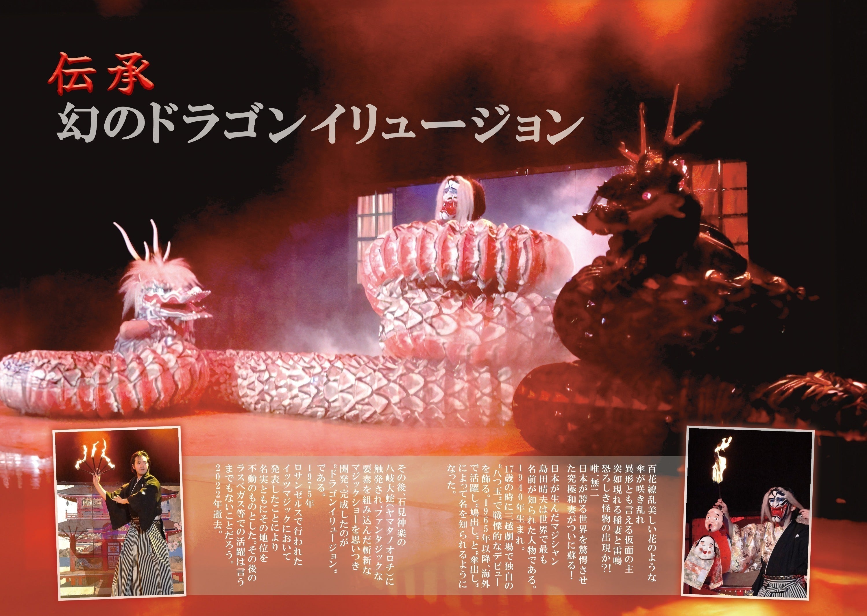 しかしながら納得いかない部分があり、完成したと自信を持って言えないことが心残りでした。芸事というものは、常に時代の変化に合わせて、自身も演目も成長しなければなりません。同じ日本人として日本人マジシャンに継いでもらいたいという島田先生の遺志を尊重しながら、私はこのドラゴンイリュージョンを私なりの形で完成させ、次世代に受け継ぐことを目標といたします。