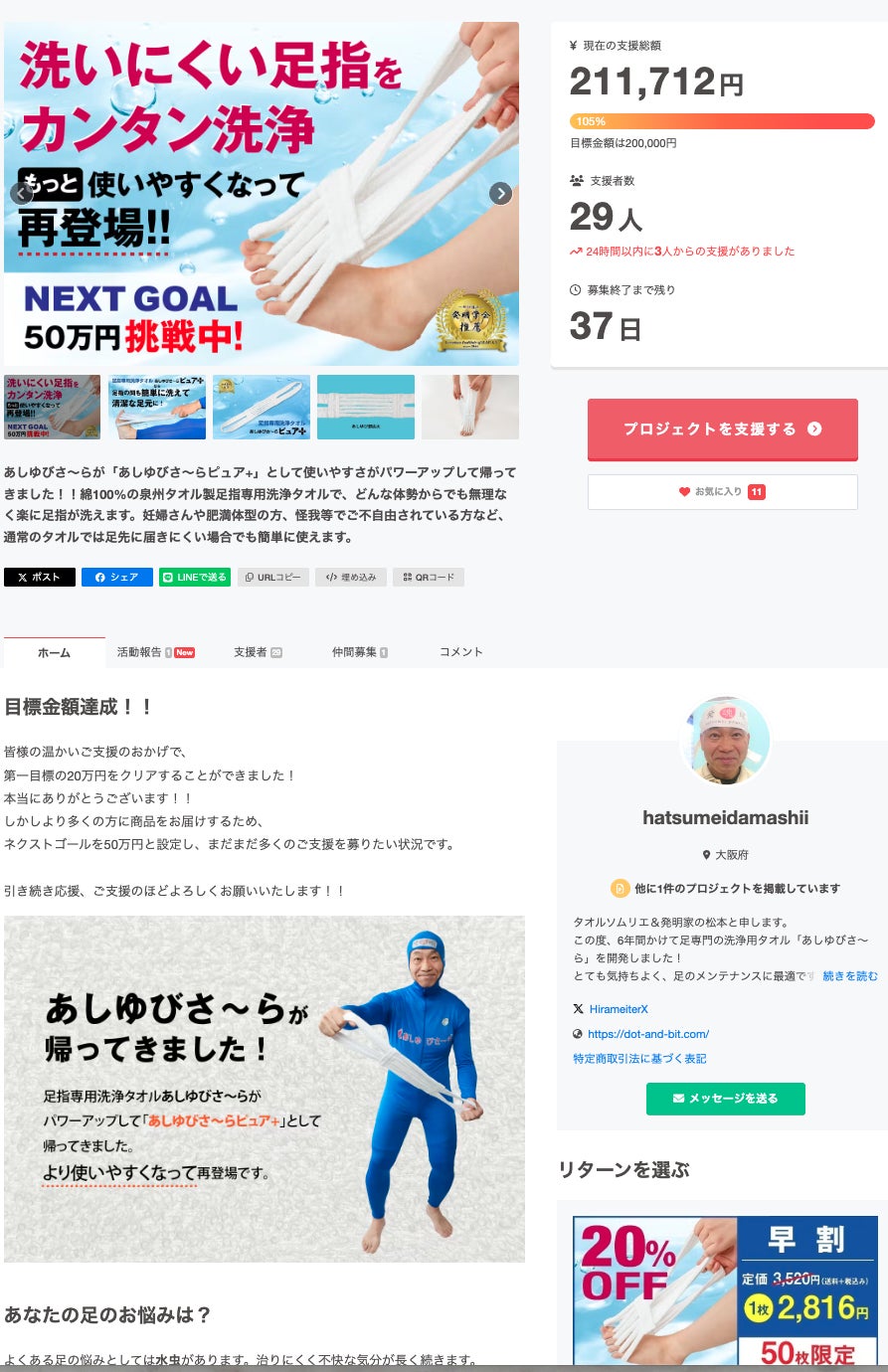 開始早期の温かいご支援のおかげで、目標額の20万円を4日目に達成することができました。心より感謝申し上げます。ネクストゴール、50万円を目指しより多くの方に「健康は足元から!」で喜んでいただけるよう進めてまいります。引き続きご支援のほど宜しくお願い致します。