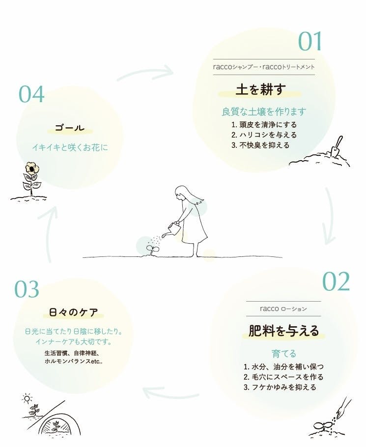 『racco』シリーズのコンセプトは、頭皮を土壌と捉え、頭皮環境を丁寧に整えることで、綺麗な花を咲かせることだと考えています。