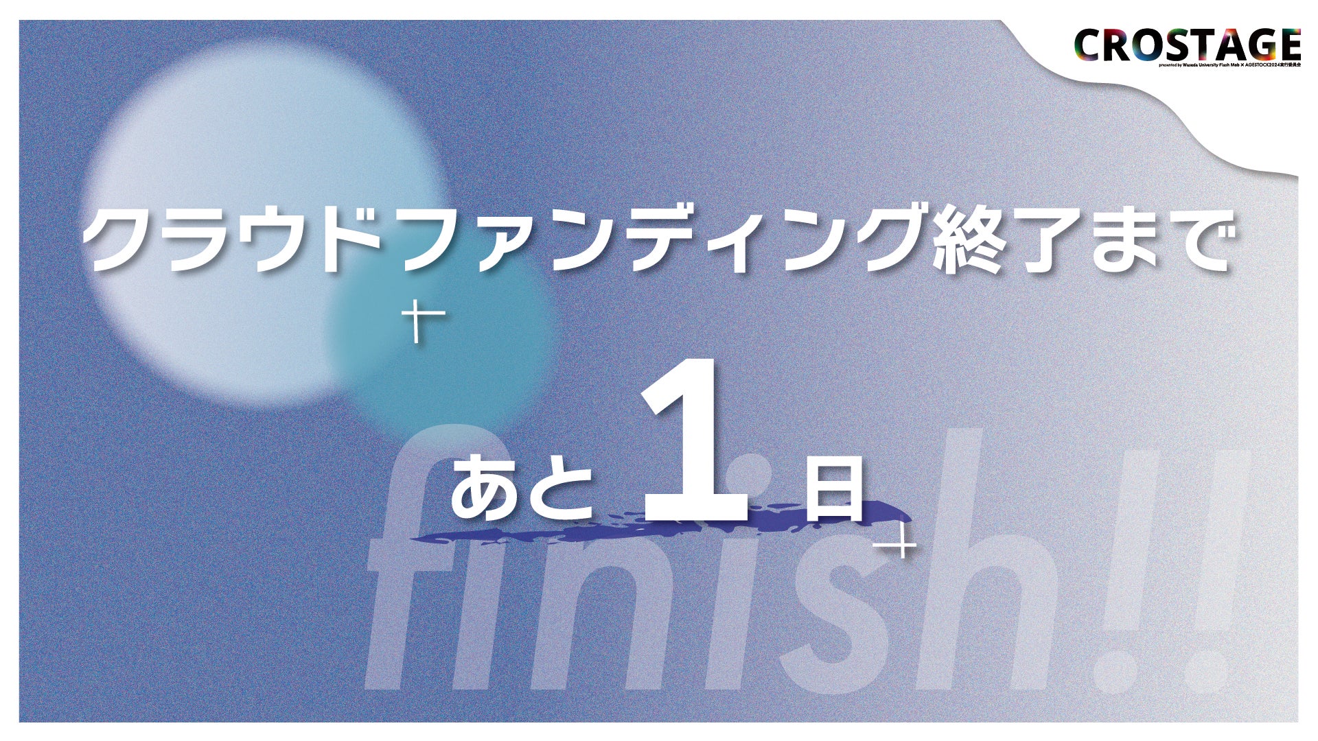 ついにクラウドファンディング終了まであと2日となりました‼ みなさまのおかげでCROSTAGEを無事成功させることができました!今後の学生の熱意を伝える機会であるイベントの開催のためにも皆様のご協力が必要です。皆様のお力を少しでもお貸しいただけると幸いです。何卒よろしくお願いいたします。