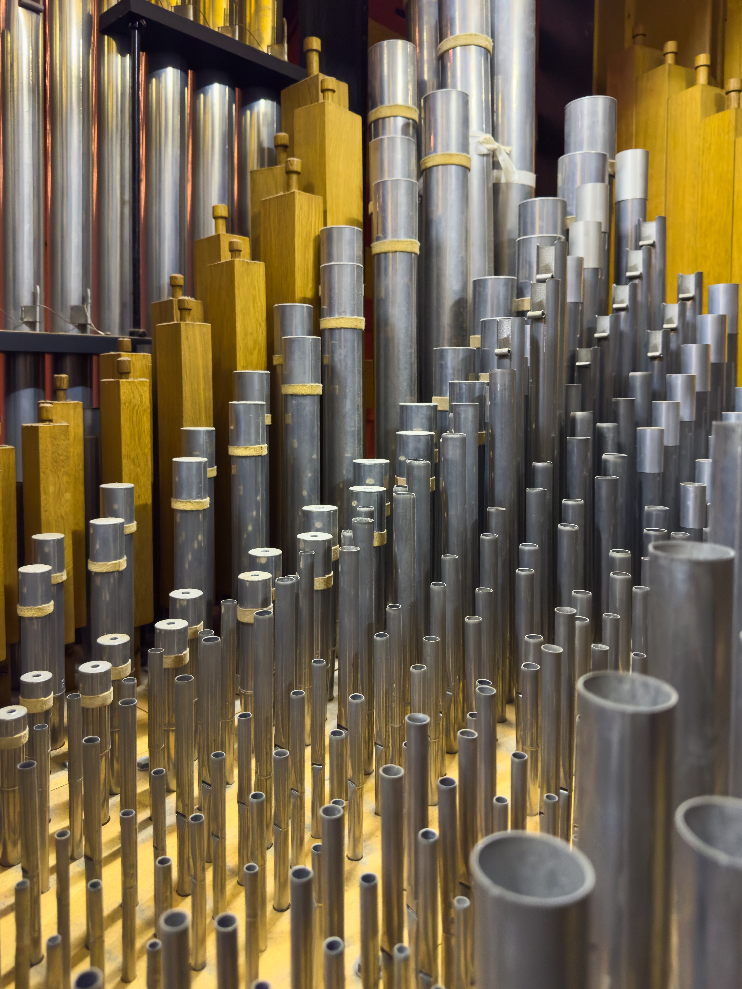 パイプオルガンのパイプは、鉛と錫で出来ており、指先でつまむと簡単に変形してしまいます。調律作業には繊細な技術が必要となります。