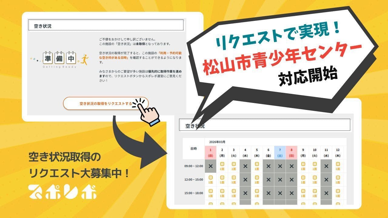 2026/03/05 18:00いつもスポーツ施設検索サイト「スポレボ」を応援くださり、ありがとうございます!このたび、サイト内のリクエストボタンで最も多くの票を集めた「松山市青少年センター」の空き状況がスポレボに反映されました!・松山市青少年センター 体育館・松山市青少年センター 体育室・松山市青少年センター 卓球場 スポレボは、運営だけで作るサービスではなく、ユーザーの皆さまと一緒に育てていくサービスです。対応してほしい施設があれば、お気軽にリクエストボタンから教えてください!あなたのスポーツライフが、もっと身近で便利なものになるよう、これからも開発を進めてまいります。 もっと見る