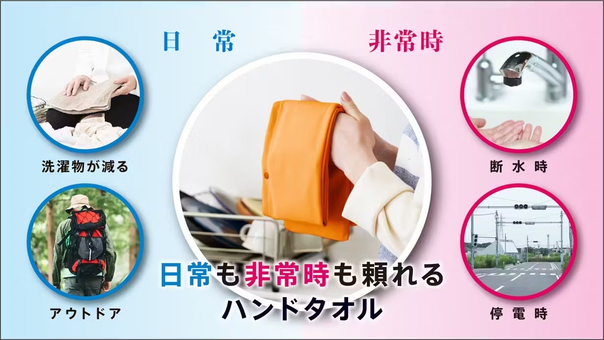 何枚も持ち歩いたり、何度も交換したりしなくて大丈夫。面倒な洗濯の手間を減らします。日常ではもちろん、断水や停電などの非常時やアウトドアでの洗濯できない・しにくい状況でも、とても頼りになるハンドタオルです。