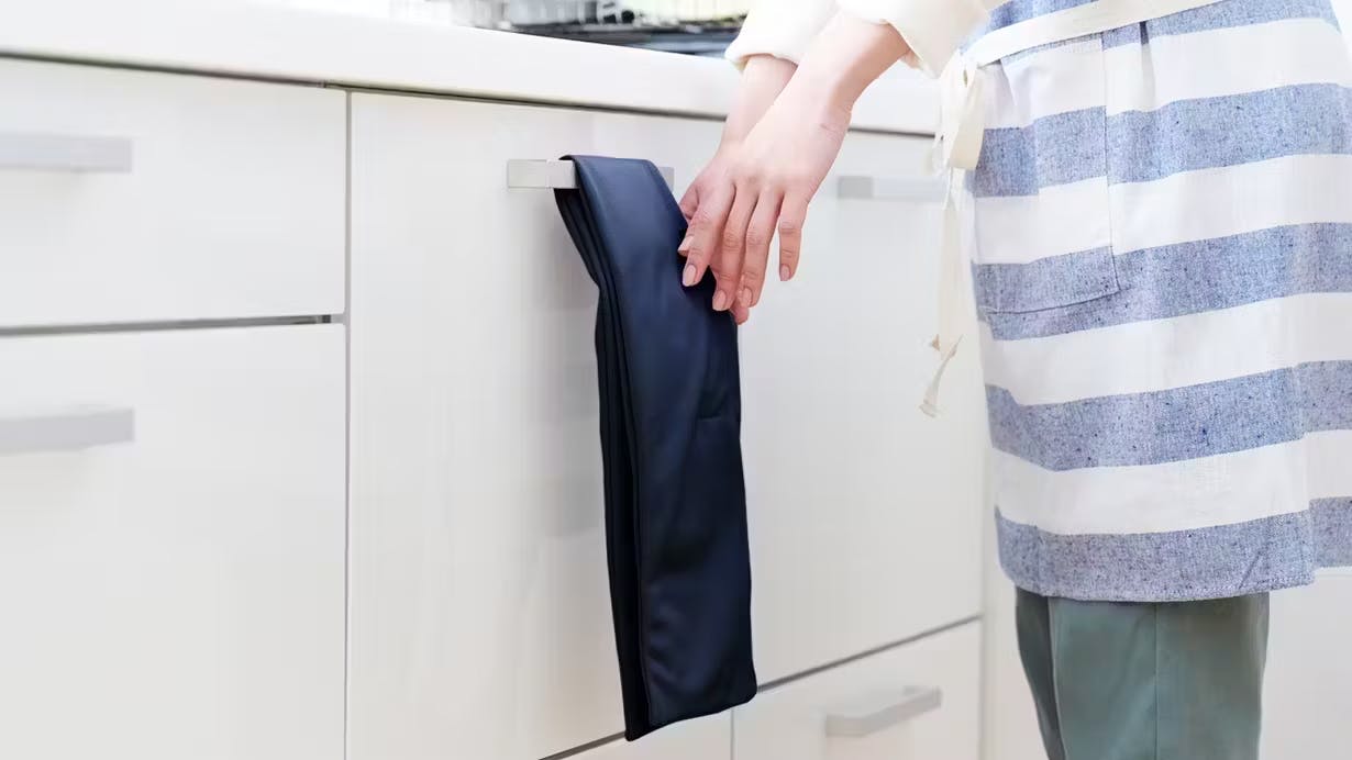 幅を細身にすることで、タオルラックに掛けやすくしました。無地でシンプルなデザインのため、どんなキッチンにも馴染みます。