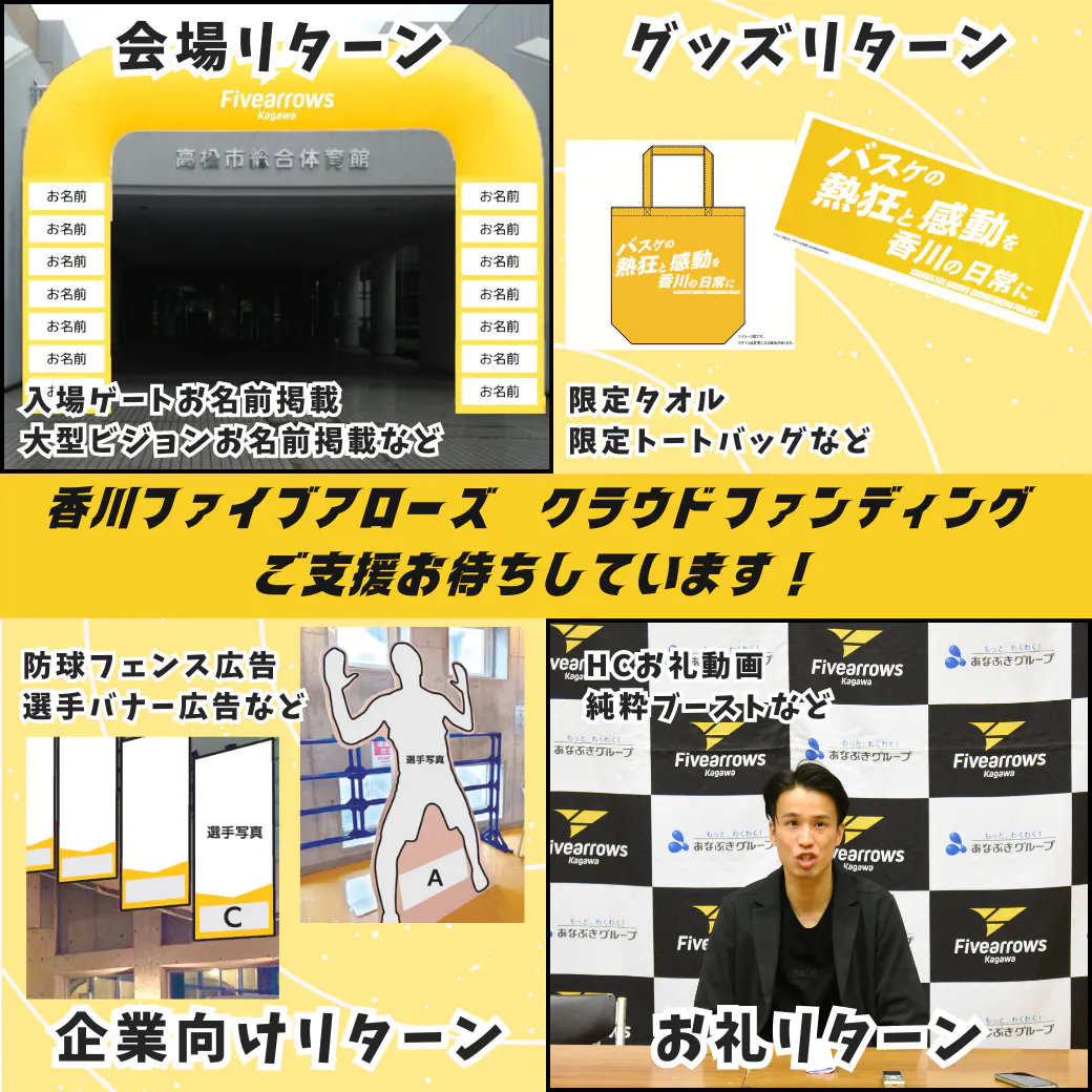 このプロジェクトを通じて、香川ファイブアローズそして香川ファイブアローズを支えてくださる皆さまのビジョンである『バスケの熱狂と感動を香川の日常に』を実現するためのご支援をいただけることを心から願っています。皆様からのあたたかいご支援が、選手たちの力となり、最高の成績を残すための大きな助けとなります。皆さまと共に手を携えながら、2024-25シーズンの成功、そして香川県のプロスポーツの輝かしい未来を実現できるよう尽力してまいりますので、どうぞよろしくお願いいたします。