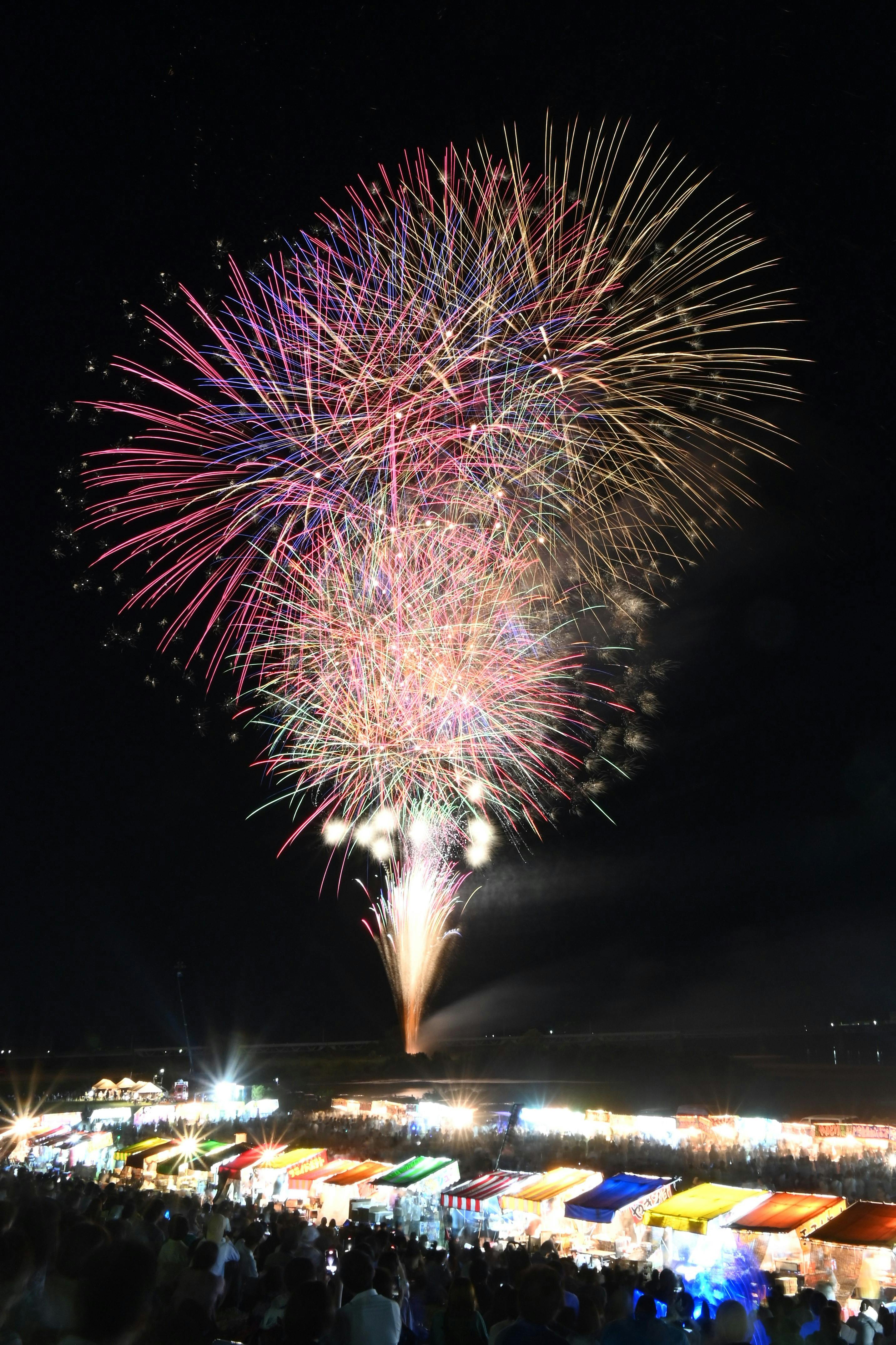 「雄物川花火大会」は雄物川放水路通水50周年を記念し、1988年に始まりました。その翌年の1989年には秋田市政100周年の記念イベントとして開催され、それ以後は秋田市の夏の風物詩として、今日まで続いているお祭りです。開催当初から5千発以上を打ち上げ、秋田市の夏を盛り上げてきたこの花火大会は、周辺地域のみならず、市外からも多くの観覧客が訪れてて、地域を挙げての一大イベントとなっています。
