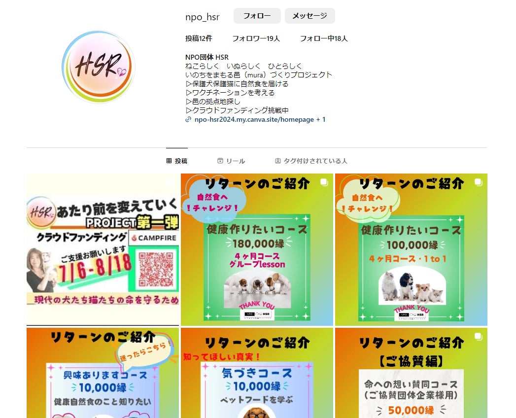 Instagramにもリターン内容を載せていますので、是非そちらもご確認ください↓↑画像を押すとInstagramへ移動できます皆さまからの“フォロー”“ハートにポチッ!”“コメント”もお待ちしてます(*^^*)NPO団体 HSR事務局