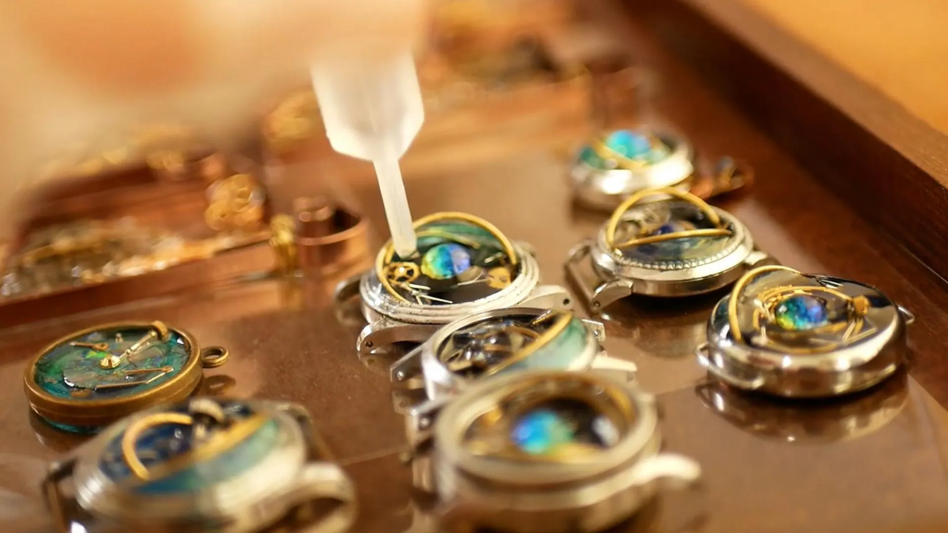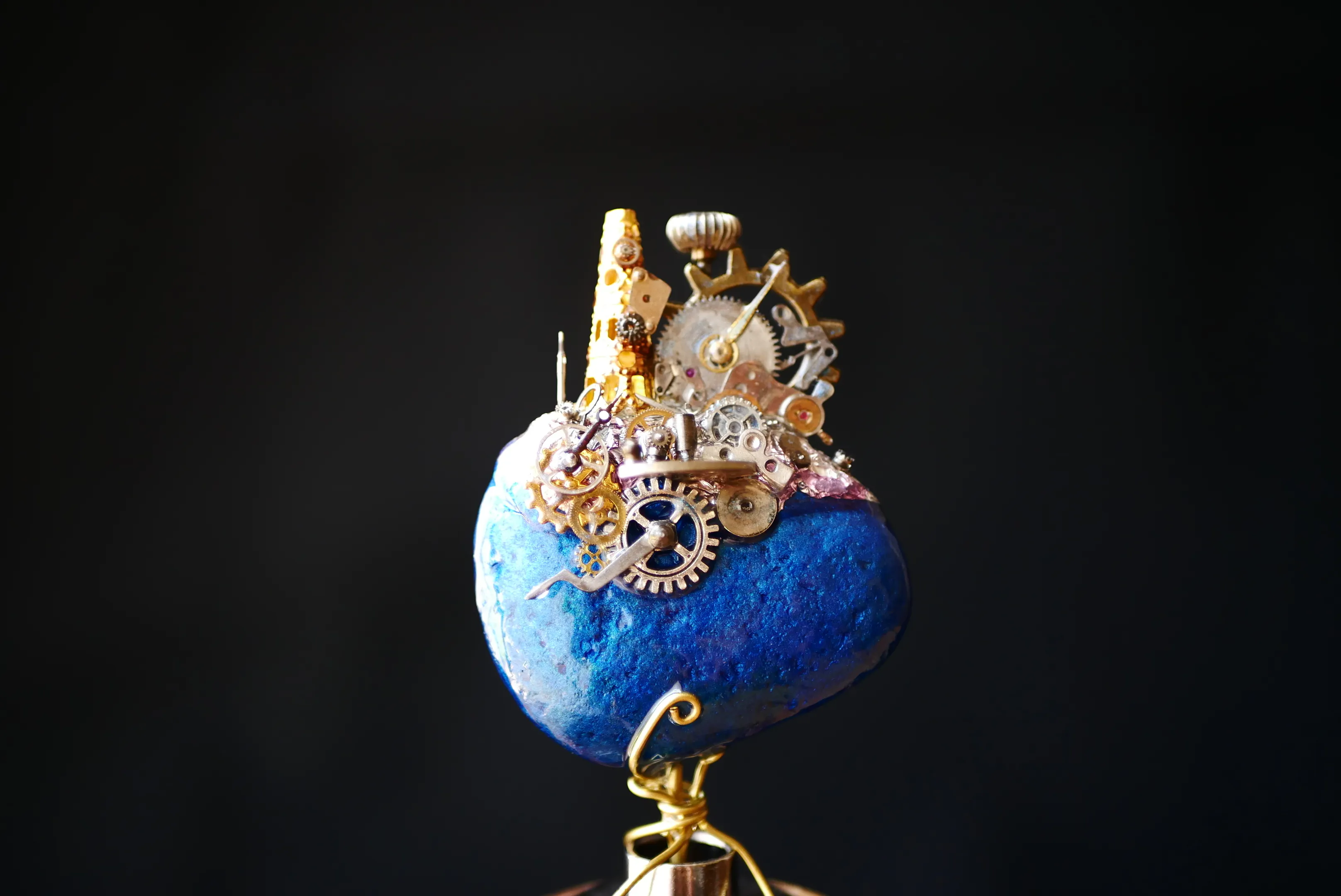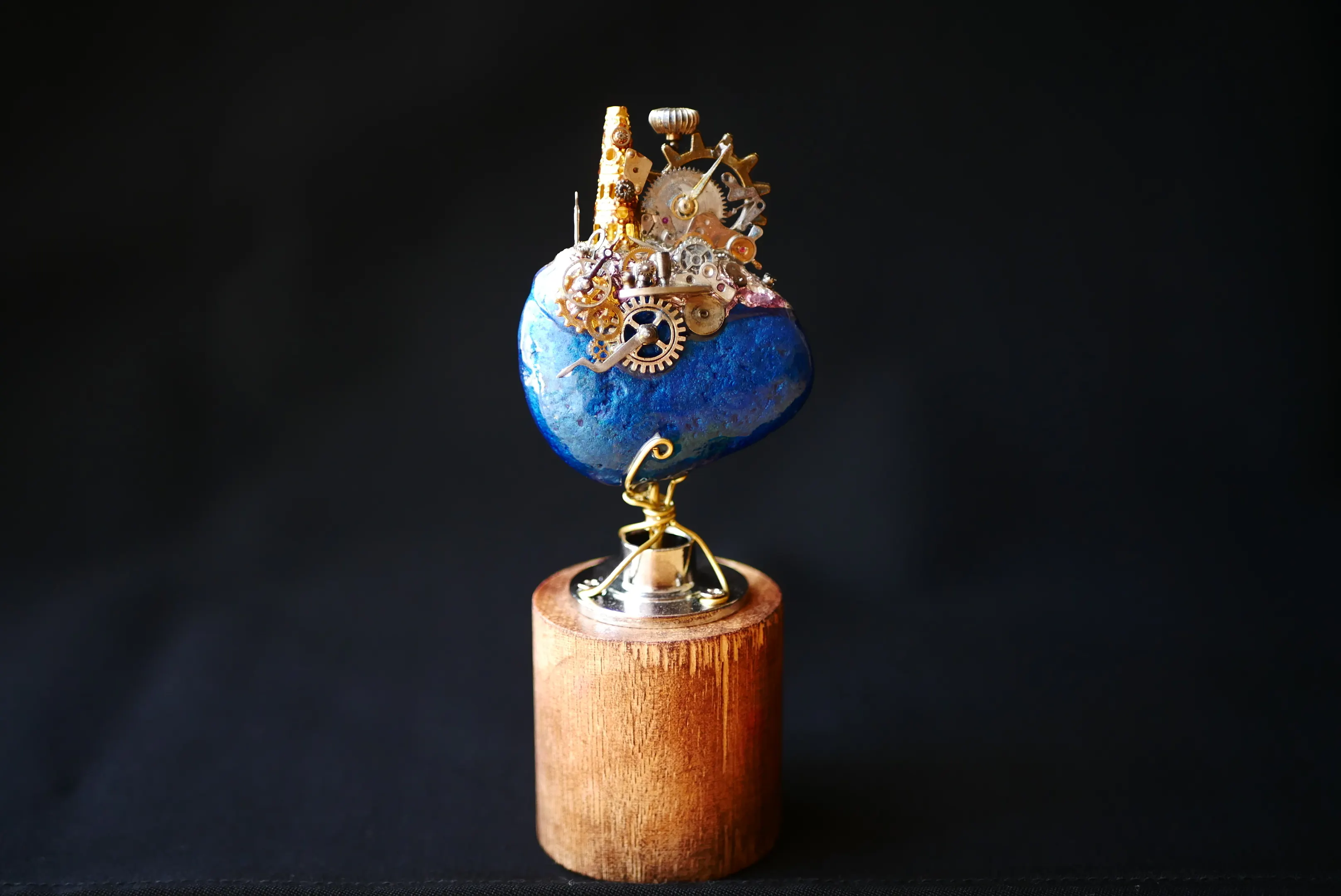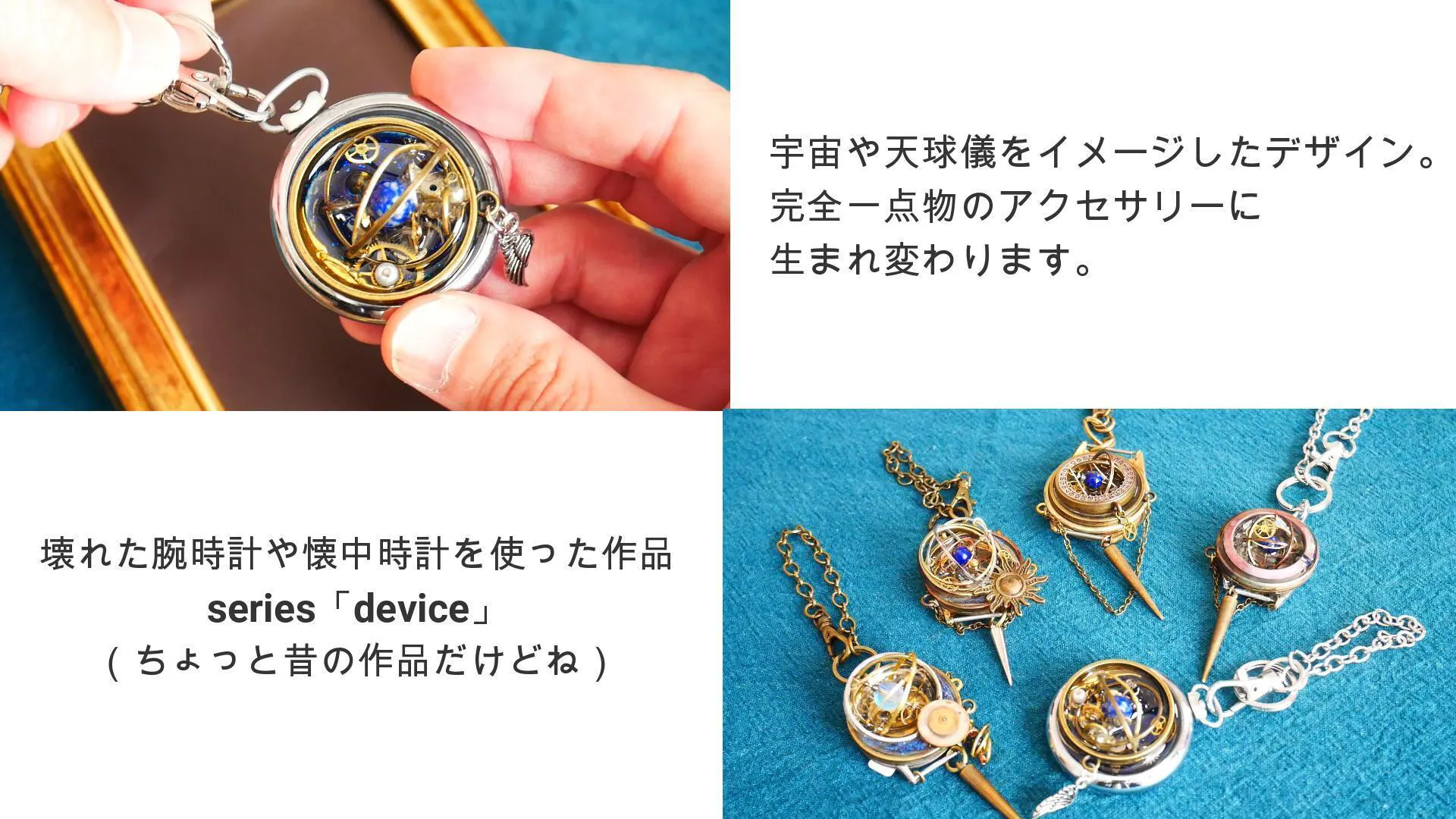 主な資材:時計部品、鉱石、ガラス、真鍮線、レジンなど。