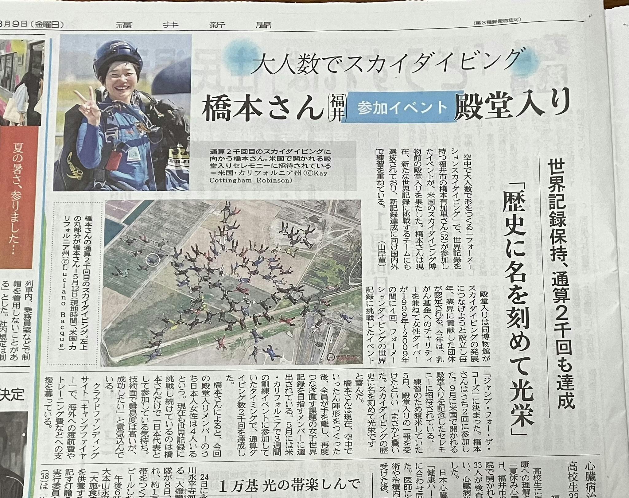 本日 8月9日の福井新聞に、スカイダイビング殿堂入り、女子世界記録挑戦の記事が掲載されました