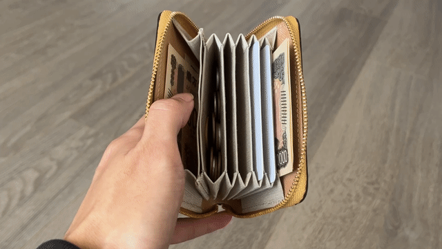 小さい財布だとお札を入れるのに苦労しませんか?三つ折りにしたり、収納に手間になることが多いですが、この財布は折らずにスッポリ入ります。