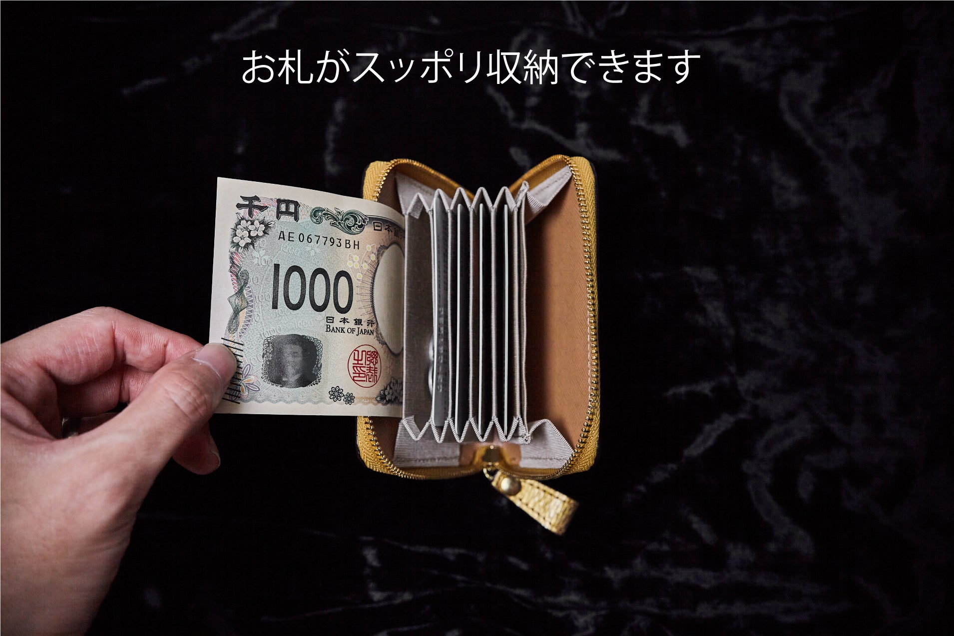 「コンパクト財布」は、使い勝手が良くすっきりと収納ができるように「蛇腹収納」を採用いたしました。