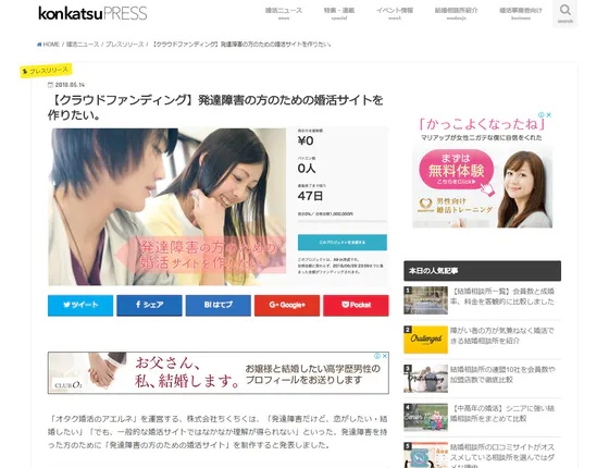 わたしたちのプロジェクト「発達障害の方のための婚活サイトを作りたい!」が婚活プレスさんとマーケジンさんに掲載されました。