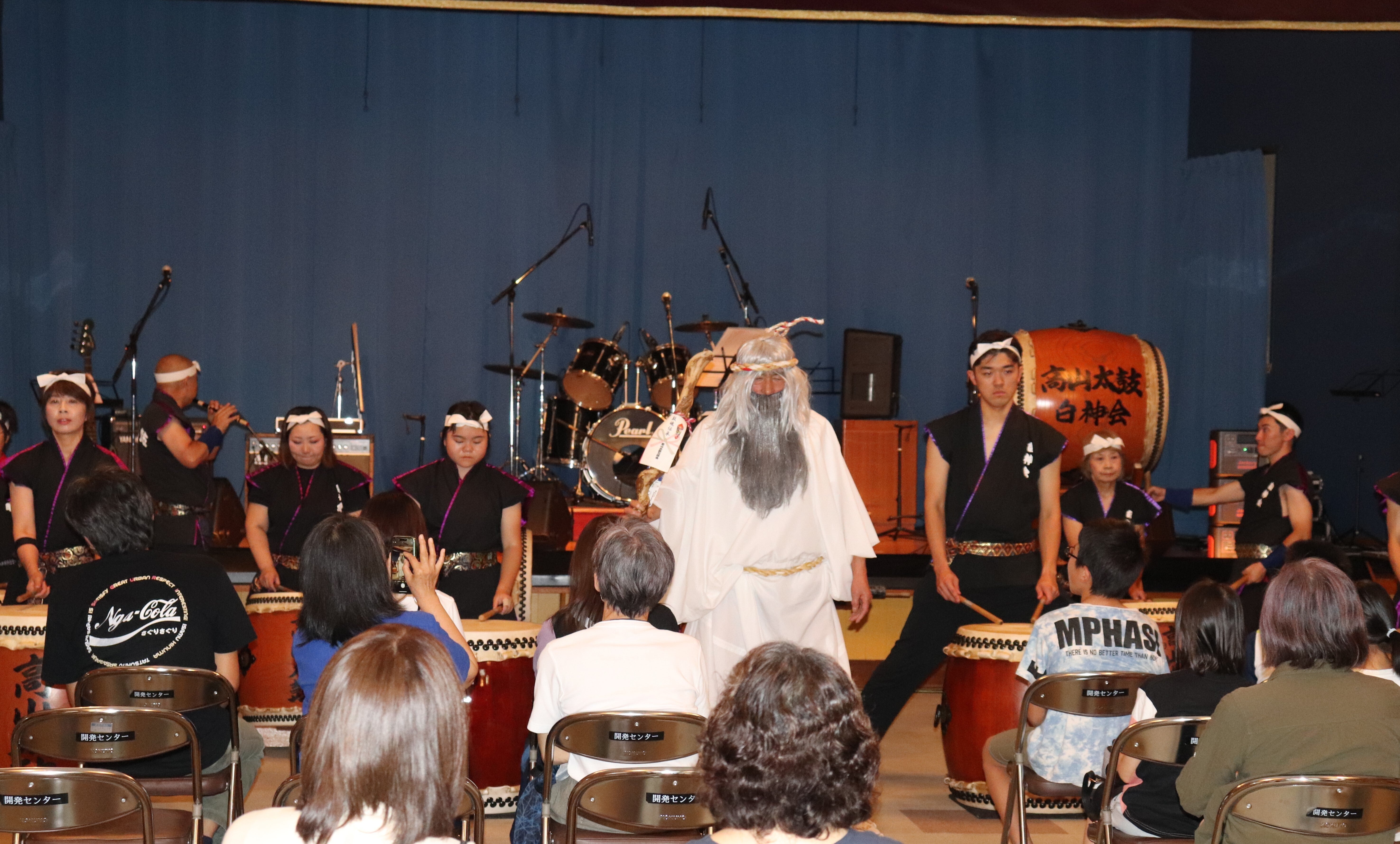 オープニングの高山太鼓白神会、「白神仙人」現る!午後2時、いよいよ開演!地元・藤里町の高山太鼓白神会の迫力ある演奏でオープニング、TKGは激しいサウンドとリズム、超絶速弾きを駆使したフレーズが炸裂!
