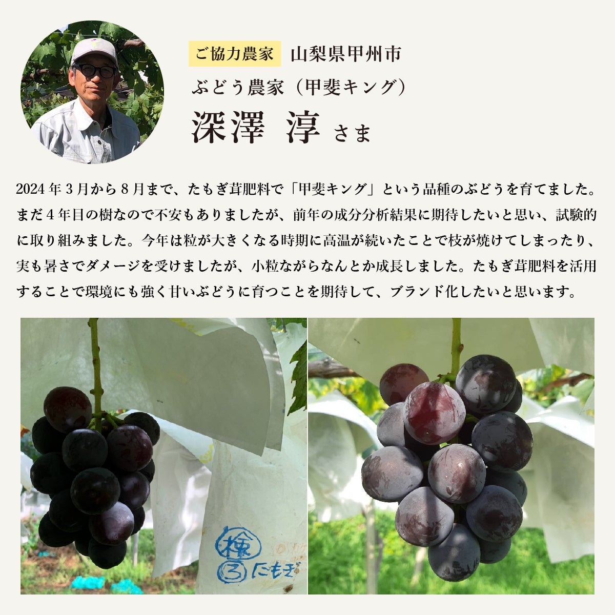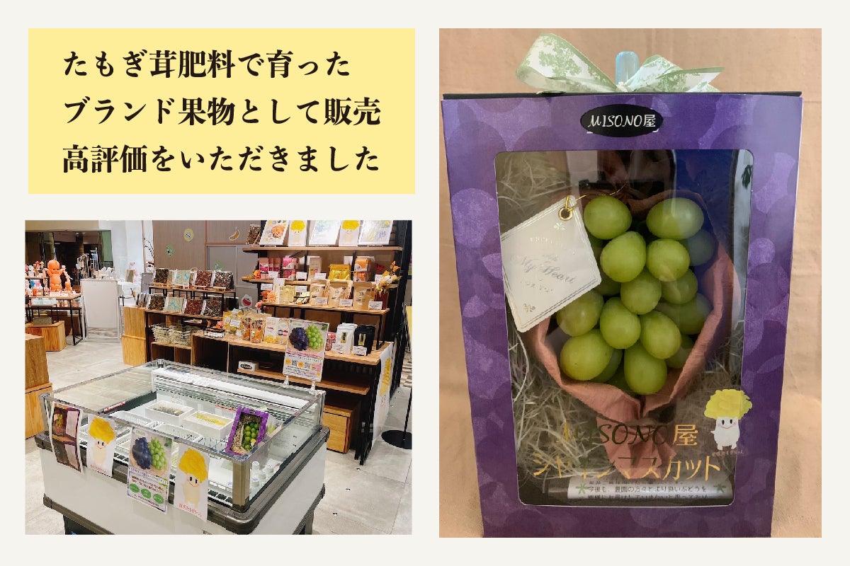実験初年度であった2023年度は、当社が農家さまからたもぎ茸肥料を用いた農産物を仕入れ、都内の百貨店やECサイトなどを通じて初出荷しました。どの販売ルートでも「ほかの果物とは味が違う」「ぜひ毎年いただきたい」などと好評をいただき、バイヤーの方々からも太鼓判を押して頂きました。
