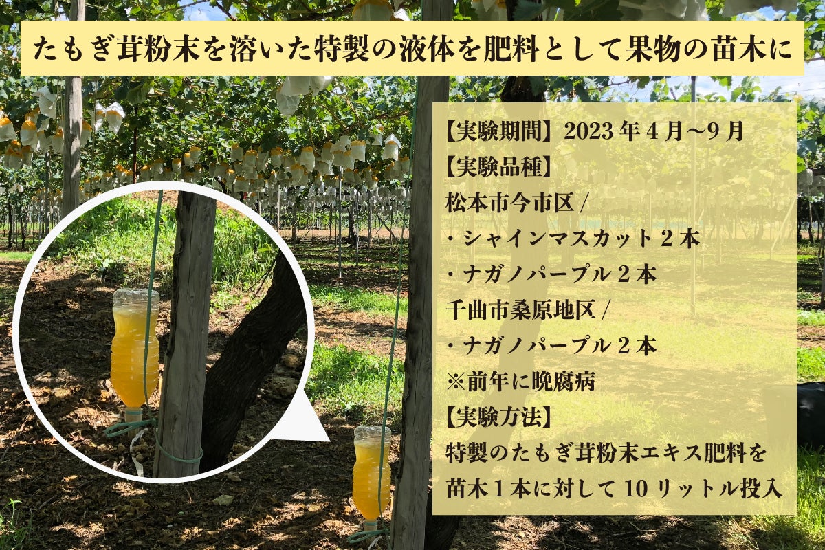 果物はエルゴチオネインを吸収することはできません。それでも、なにか変化が起こるのではないか。そんな期待を膨らませながら、長野県内2か所のぶどう農家さんご協力のもと、2023年度に初めての実験を開始しました。