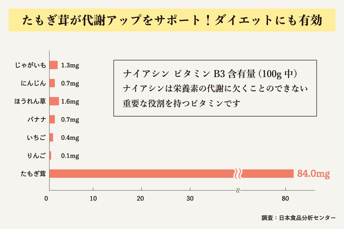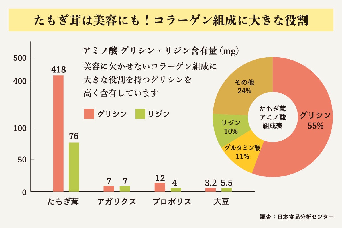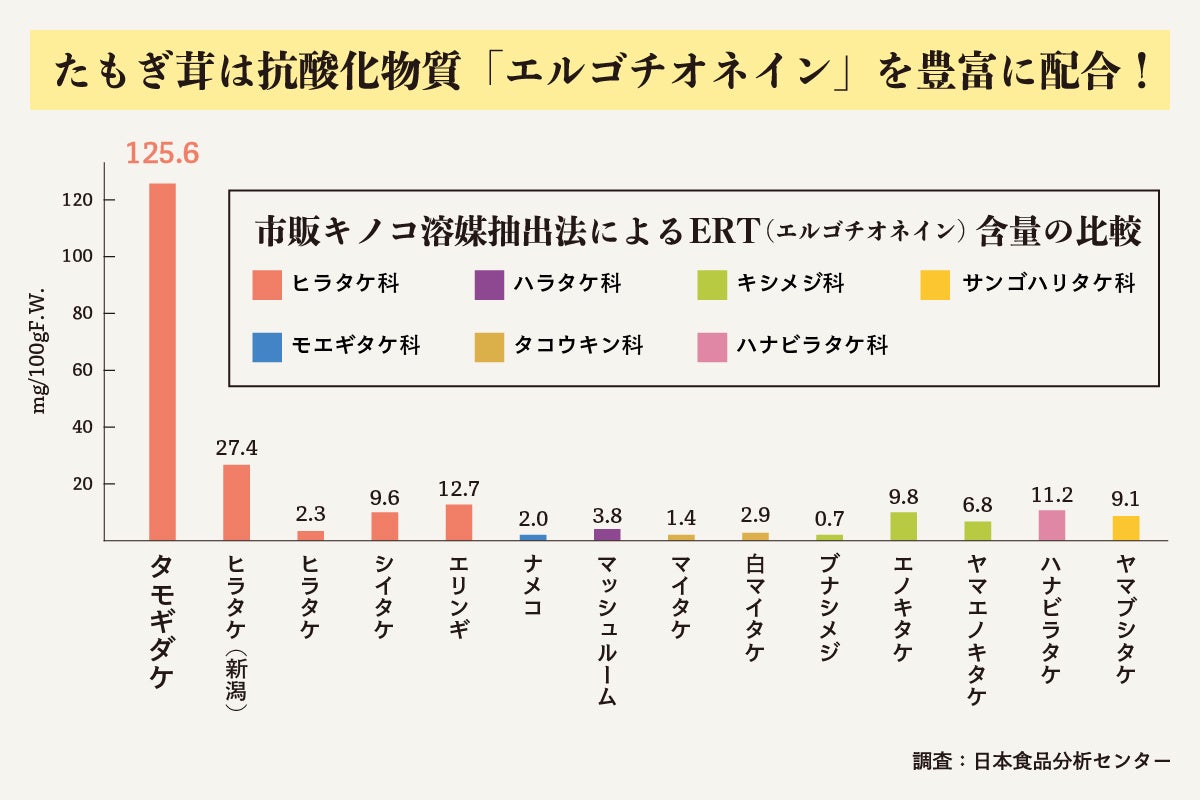 エルゴチオネインは様々なキノコから接種することができますが、たもぎ茸における含有量はご覧のとおり抜群。これからの健康・美容食として欠かせない食材なのです。