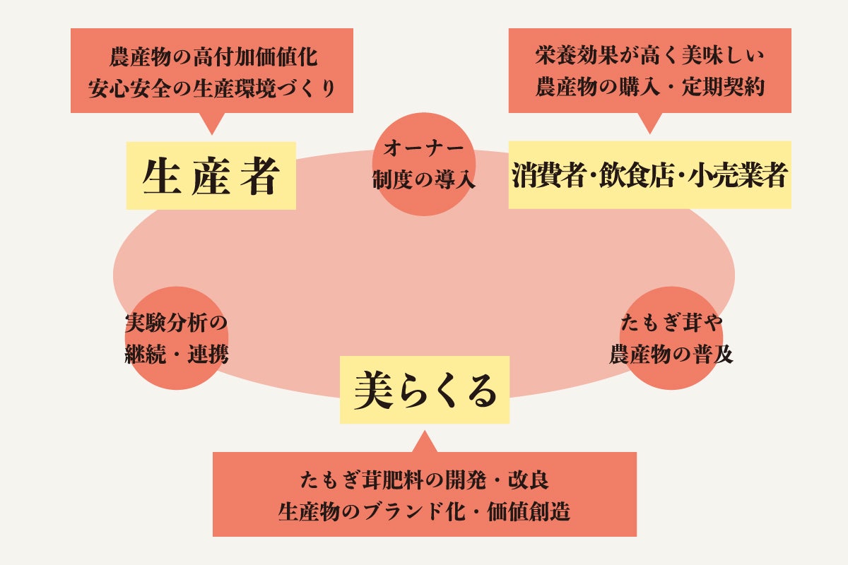 両者に大きなメリットをもたらす「たもぎ茸肥料の本格実用化」をきっかけに、新しい食の好循環を生み出すことが、当社の役目であると考えています。