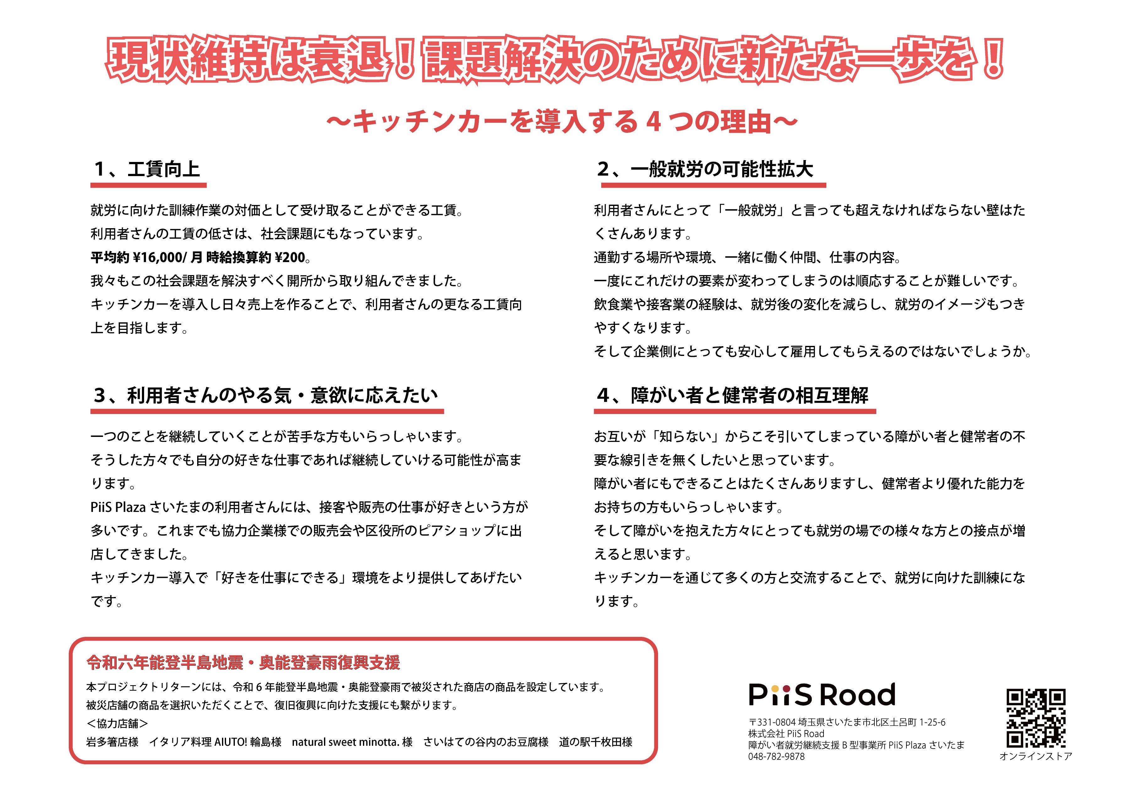 キッチンカー導入には500万円のご支援が必要であり、まだまだ目標額は遠い状況です。