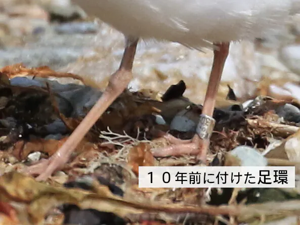 つい先日分かったことなのですが、なんと10年前に足環を付けた当時のひな鳥が成長して帰ってきたのです。下の写真がそのコチドリです。私たちは「続けてきてよかった」と、とても感動しました。