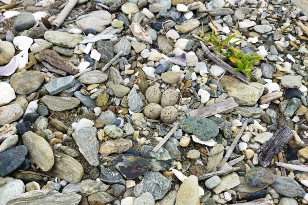 こうざき海岸はバラス砂利の海浜で、コチドリの産卵地として適しています。下の写真は2024年6月に発見されたものですが、バラス砂利の保護色に隠れ、他から見えにくくなっています。