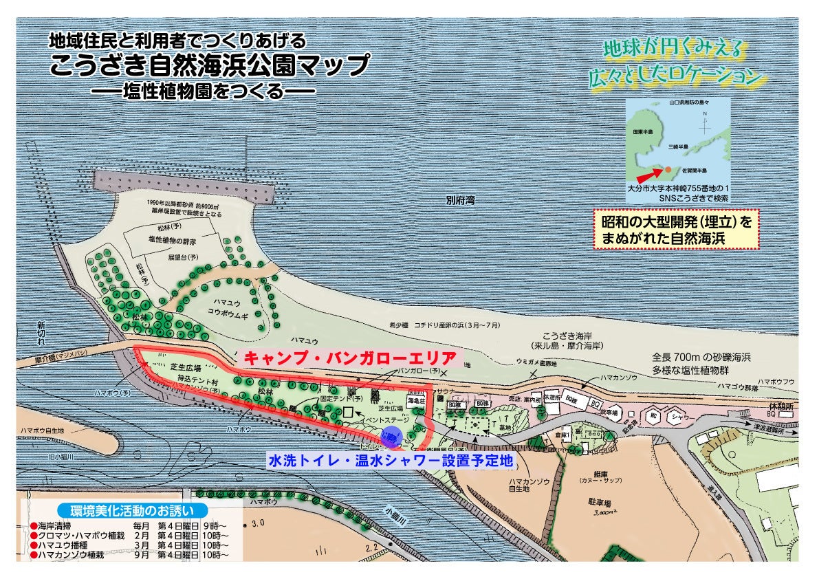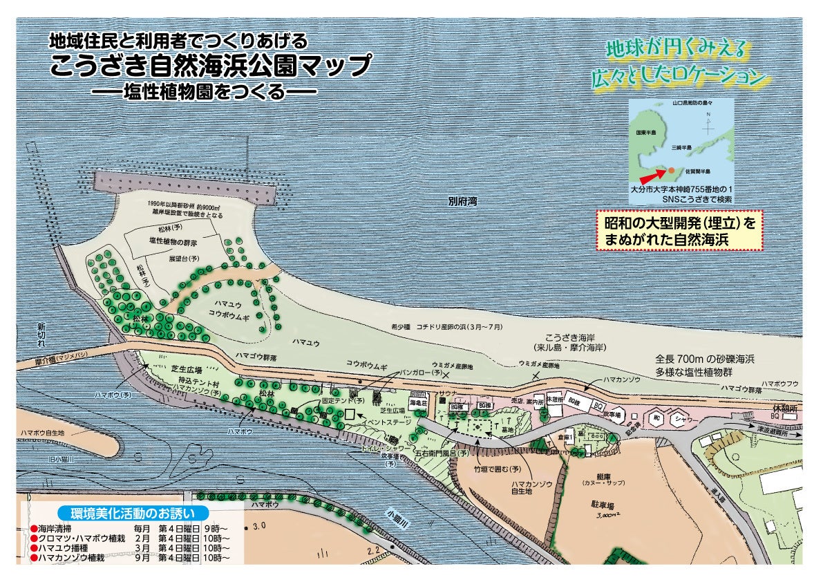 こうざき自然海浜公園は大分市東部、佐賀関半島の別府湾側基部にあります。私たちは1981年からこの海岸を手作りで整備してきました。