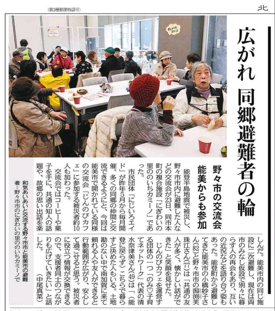 こんばんはにじいろエイドです。昨日能美市寺井地区公民館にて、三道山子ども食堂さん主催パントリー&カフェににじいろエイドも野々市から参加してきました!三道山子ども食堂さんは、能登半島地震の発生により能美市に避難してきた方々のために、「じんのびカフェ」として被災者交流支援を行っています。記念すべき第100回目にお邪魔させていただきました。当初は大雪で安全面に不安があり、皆さんと一緒に出発できるか心配しましたが、三道山子ども食堂の代表の方やボランティアの運転手の方、にじいろエイドメンバーと熟慮を重ねた結果、参加者の安全を最大限に考慮して出発することを決定し、無事に行ってまいりました!じんのびカフェでは、交流会だけでなく、マジックショーや能美シビックさんによるライブも行われ、大変盛り上がりました。参加者の皆さまの笑顔がたくさん見られて、私もとても嬉しかったです。参加者の皆さまからは「楽しかった~」「連れてきてくれてありがとう」「久しぶりの友達に会えて嬉しかった」など、大満足の様子でした。招待してくださった三道山子ども食堂さん本当にありがとうございました<(_ _)>今後もコラボレーション企画がありますので、一緒に楽しみながら被災者支援を続けていきましょう!引き続きよろしくお願いします。