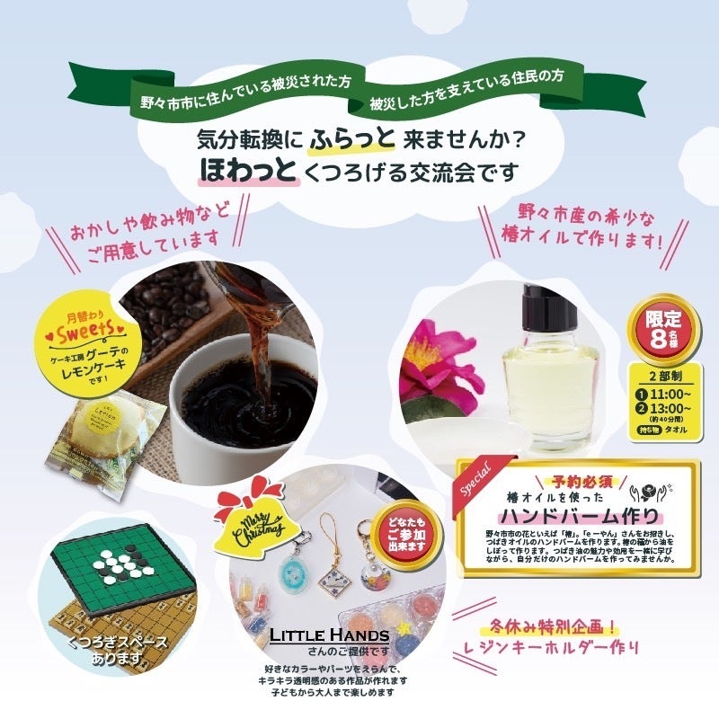 第8回目にじいろエイドのイベントでは①椿オイルのハンドバーム作り②レジンキーホルダー作りを行います!しかーし!!①椿オイルのハンドバーム作りは定員に達しましたので、受付を終了させていただきます_(._.)_ご応募ありがとうございました☆今回は椿オイルを絞り出す機械から実際にオイルを抽出し、オリジナルのハンドバームを作ります♪皆さん、どのような表情で作るのか、今からワクワクします!(^^)!②は予約不要です!今回、講師として皆さんに作り方を教えてくれるのは、スタッフの娘さん(小6)です。作品を見せてもらったのですが、まあ、本当に上手で、販売してもおかしくないくらい、クオリティが高いのです!!この先生が丁寧に指導するので、作品作りに自信がない方も一緒に楽しんで作りましょう♪もうすぐ能登半島地震が起こって1年が経ちます。この間にも、数えきれないくらいの地震があったり、私たちの心を折るには十分なくらいの豪雨がありました。立ち直れないかも・・。どうして私たちはこのような試練を与えられるんだろう・・。悩んで前を向けない日も沢山ありました。しかし、金銭的に支援して下さった皆さまのおかげで、「がんばっているのは私たちだけではないんだな」「応援してくれている人がいる」と思い、前を向ける日々が増えてきました。ここまで無事に毎月イベントが行うことができたのは、本当に皆さまのおかげです。心から感謝しています_(._.)_ 本当に本当にありがとうございます。私たちは今後もにじいろエイドの活動を通して、能登半島地震(&奥能登豪雨)で被災した方々の孤立を防ぎ、新たなコミュニティ作り、横のつながりを作るためのサポートを行います!!引き続き、応援をよろしくお願いします☆☆