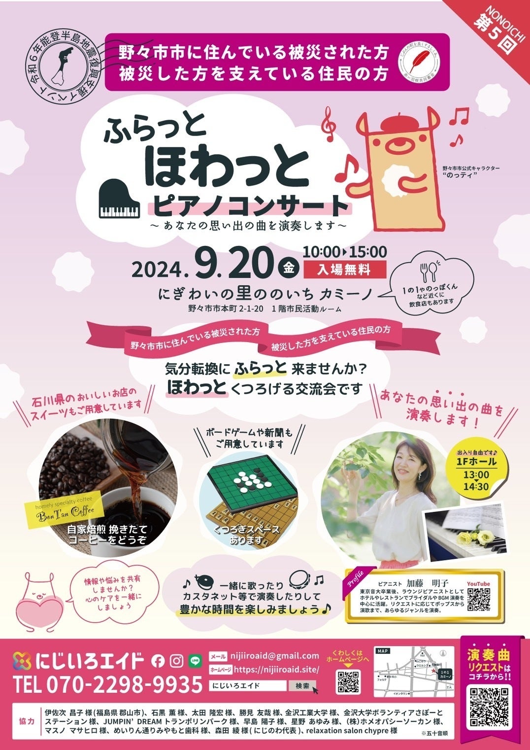 9月20日(金)13:00~14:30カミーノ1Fホールにて、野々市市に二次避難している方、支援している住民の方を対象に「ピアノコンサート」を行います。 ピアニストは加藤明子様。東京音大卒業後ラウンジピアニストとして、ホテルやレストランでブライダルやBGM演奏を中心に活躍。リクエストに応じてポップスから演歌まであらゆるジャンルを演奏しています。コンサートといっても、堅苦しいものではなく、一緒に歌ったり、カスタネット等で演奏したりします。好きな曲を聞きながら皆さんで、歌ったり、青春を思い出したりして豊かなひと時を一緒に楽しみましょう。また、お隣にあります「市民活動ルーム」にて10:00~いつも通り「にじいろカフェ」をオープンしています。美味しいお菓子(今回は米屋さんのシフォンケーキ☆)、コーヒー、将棋などのボードゲームもご用意してあります。ぜひお気軽にお越しください!今後も私たちにじいろエイドは、皆さまに寄り添って共に歩んでいきます。待っとるさかいね~!