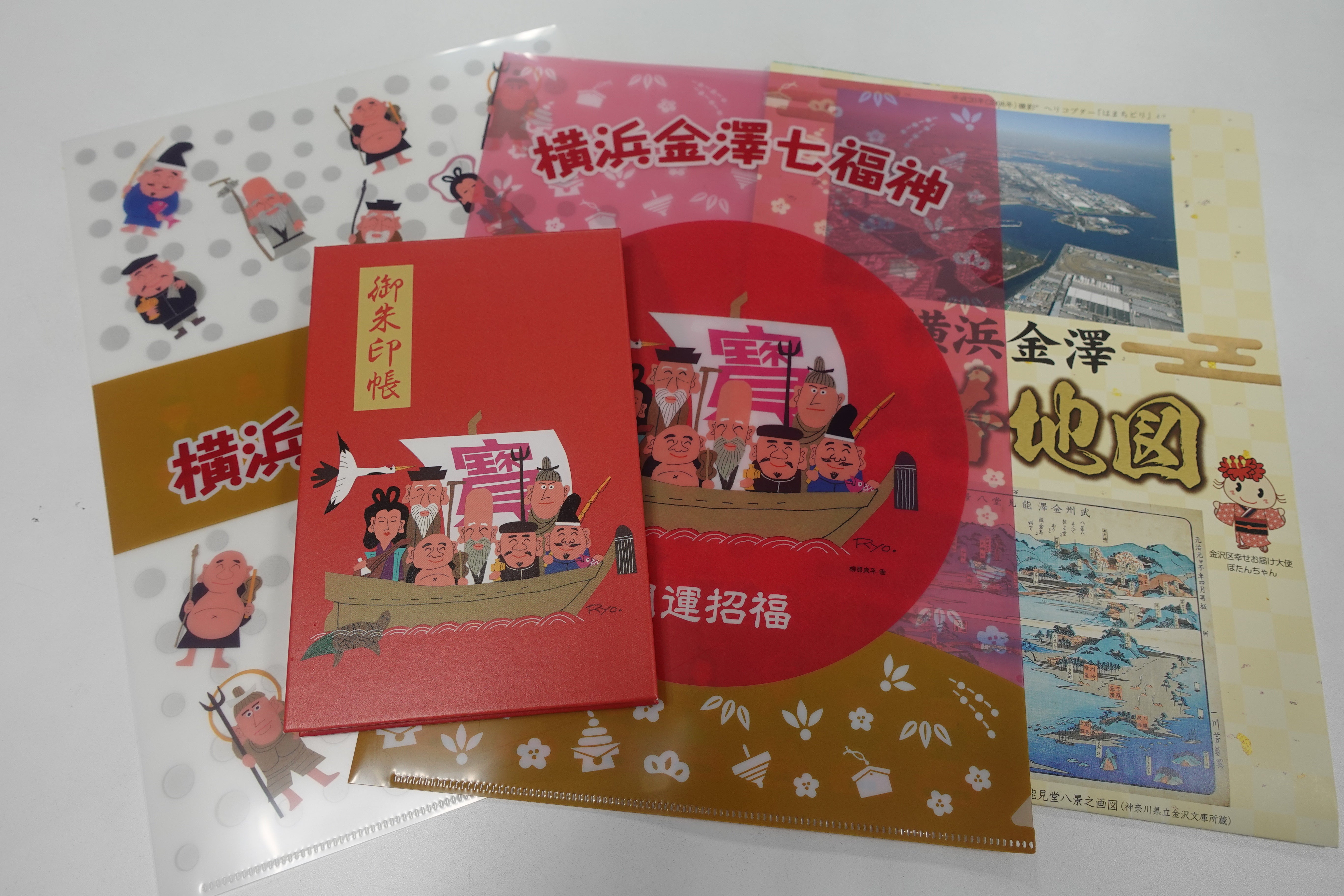 “アンクルトリス”の生みの親であり、船と海をこよなく愛した「柳原良平氏」の描く可愛らしい七福神がデザインされた御朱印帳とクリアファイル。そして、昔と今の横浜金沢を重ねて見る事が出来る今昔地図のセット。