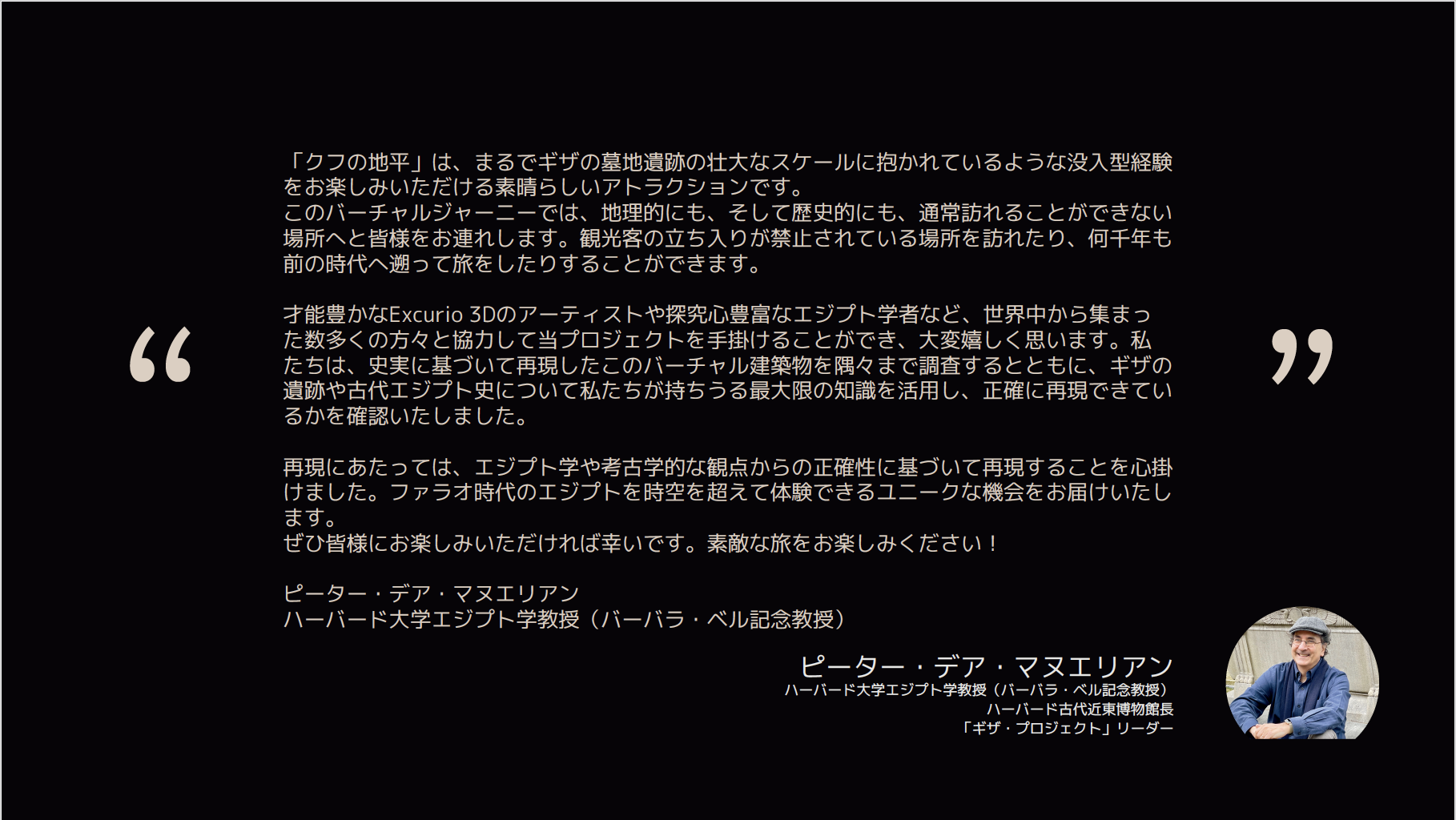 「Horizon of Khufu」は、著名なエジプト学者、考古学者、および碑文学者で、ギザの墓地遺跡を中心とした葬祭用建築物の研究を専門とするピーター・デア・マヌエリアン氏に協力を仰ぎ、当バーチャルツアーを考案いただくとともに、当時の建築物や儀式を史実に基づいて再現いただき、科学的見地から見て正確な「クフの地平」を実現しました。タフツ大学でエジプト学の教鞭を執り、ボストン美術館のギザ・アーカイブで責任者を務めた後、2010年からはハーバード大学でエジプト学の教授を務めています。ハーバード古代近東博物館の館長も務めるマヌエリアン氏は、ギザにおける過去、現在、そして未来の考古学的活動をすべて収集し、オンラインで公開することを目的とした「ギザ・プロジェクト」でも、リーダーとしてプロジェクトを進めています。マヌエリアン氏は、自身の研究や教育プログラムに新たなテクノロジーを導入することも提唱しています。特に、没入型3Dテクノロジーは、考古学的研究に活用できるツールであると考えています。