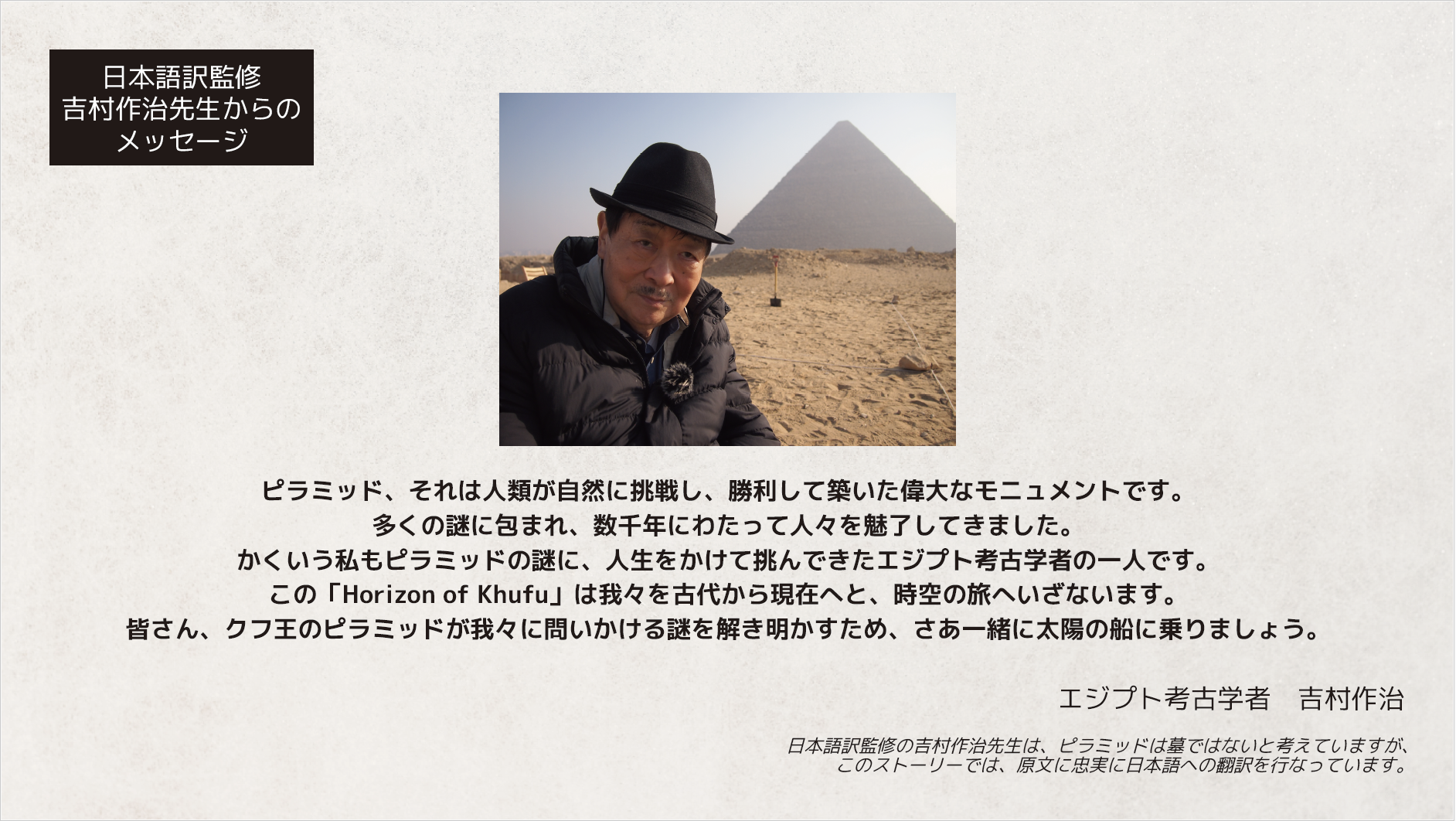 「Horizon of Khufu」の脚本の日本語訳にあたっては、エジプト考古学者の吉村作治先生に監修をお願いいたしました。