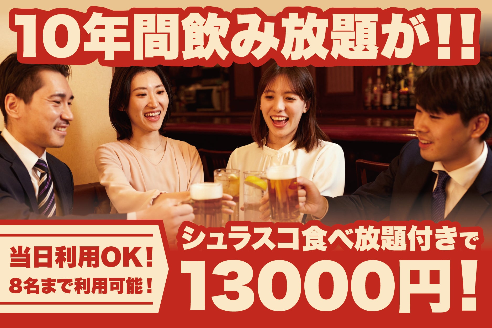 なんと!ゴールド会員様ご本人様だけでなく、2名様以上最大8名様まで、10年間ずーっと飲み放題が適用されるんです!